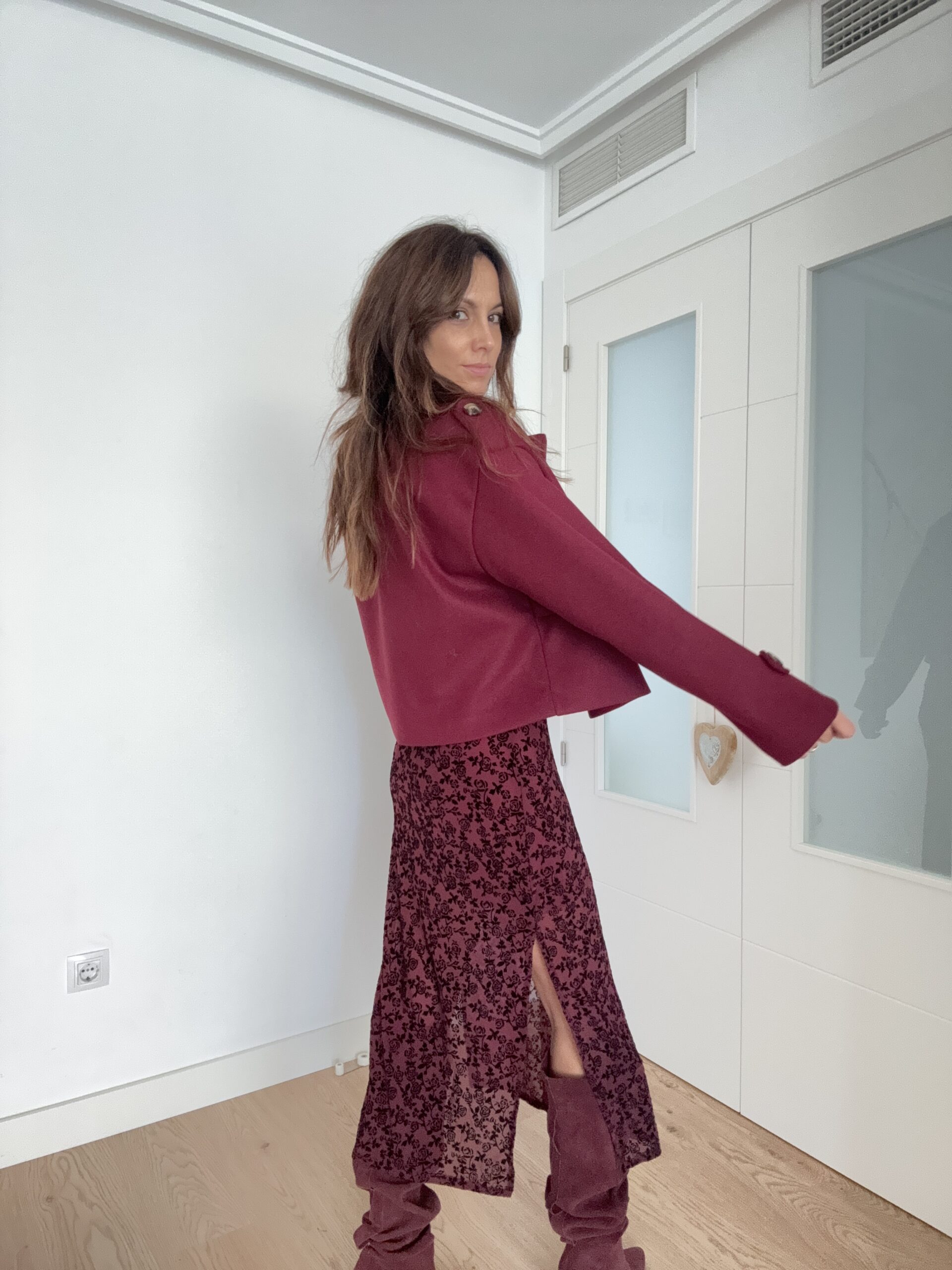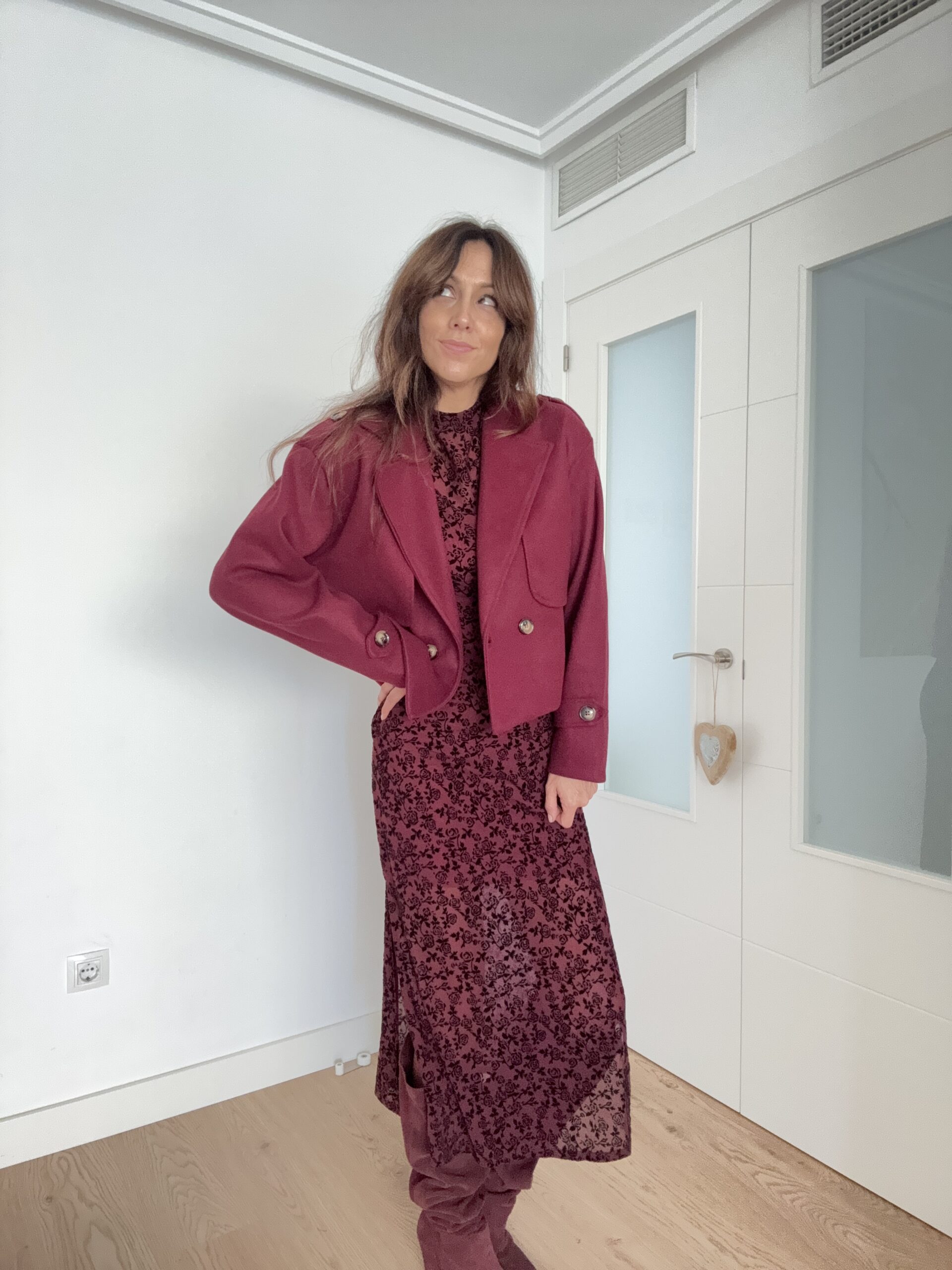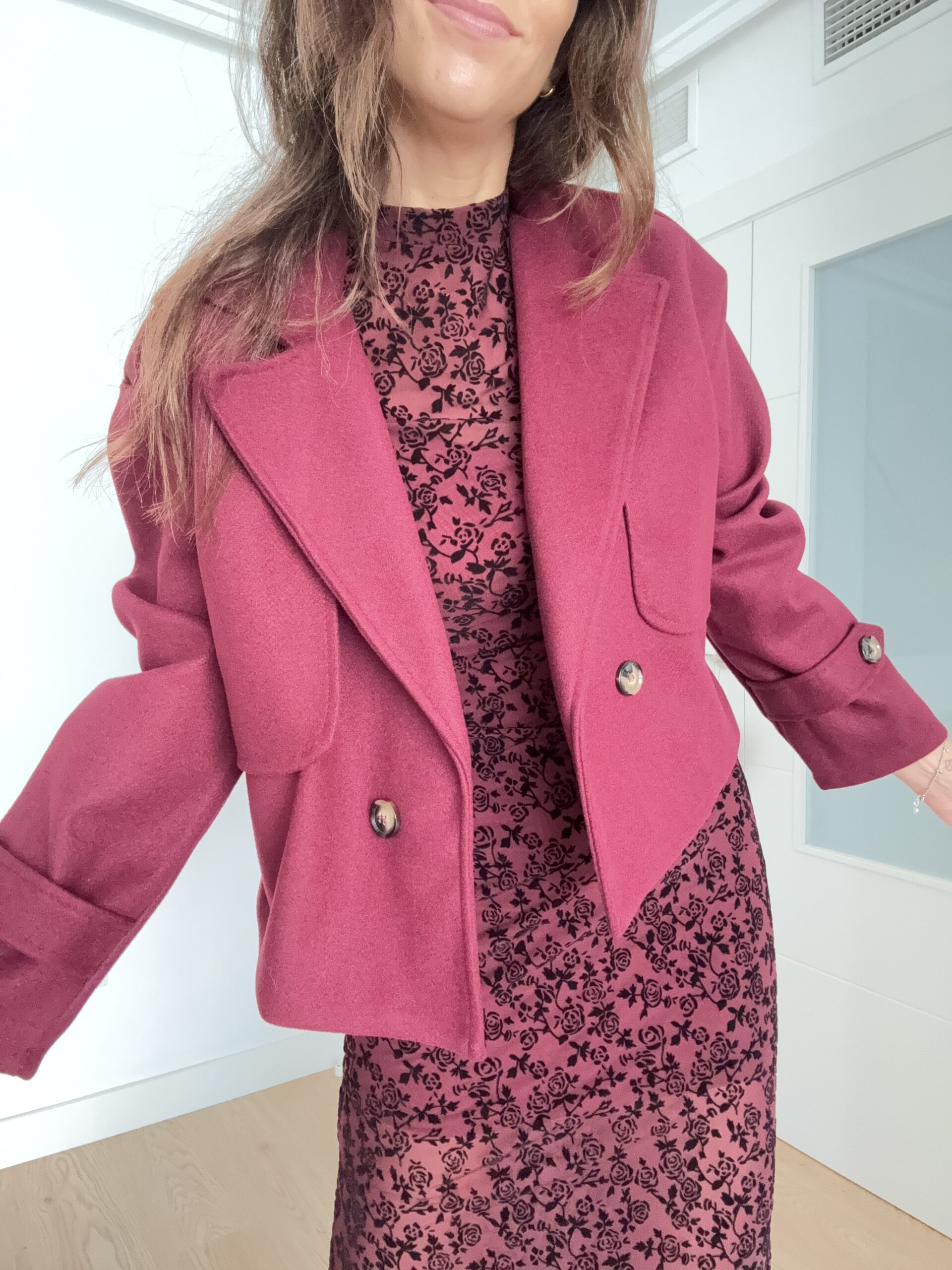 La chaqueta tiene un diseño corto tipo trench, perfecto para combinar con vestidos, pantalones o faldas, creando looks elegantes y modernos tanto de día como de noche. Su corte favorecedor y minimalista permite adaptarla a diferentes estilos, desde un outfit casual chic hasta un look más formal.