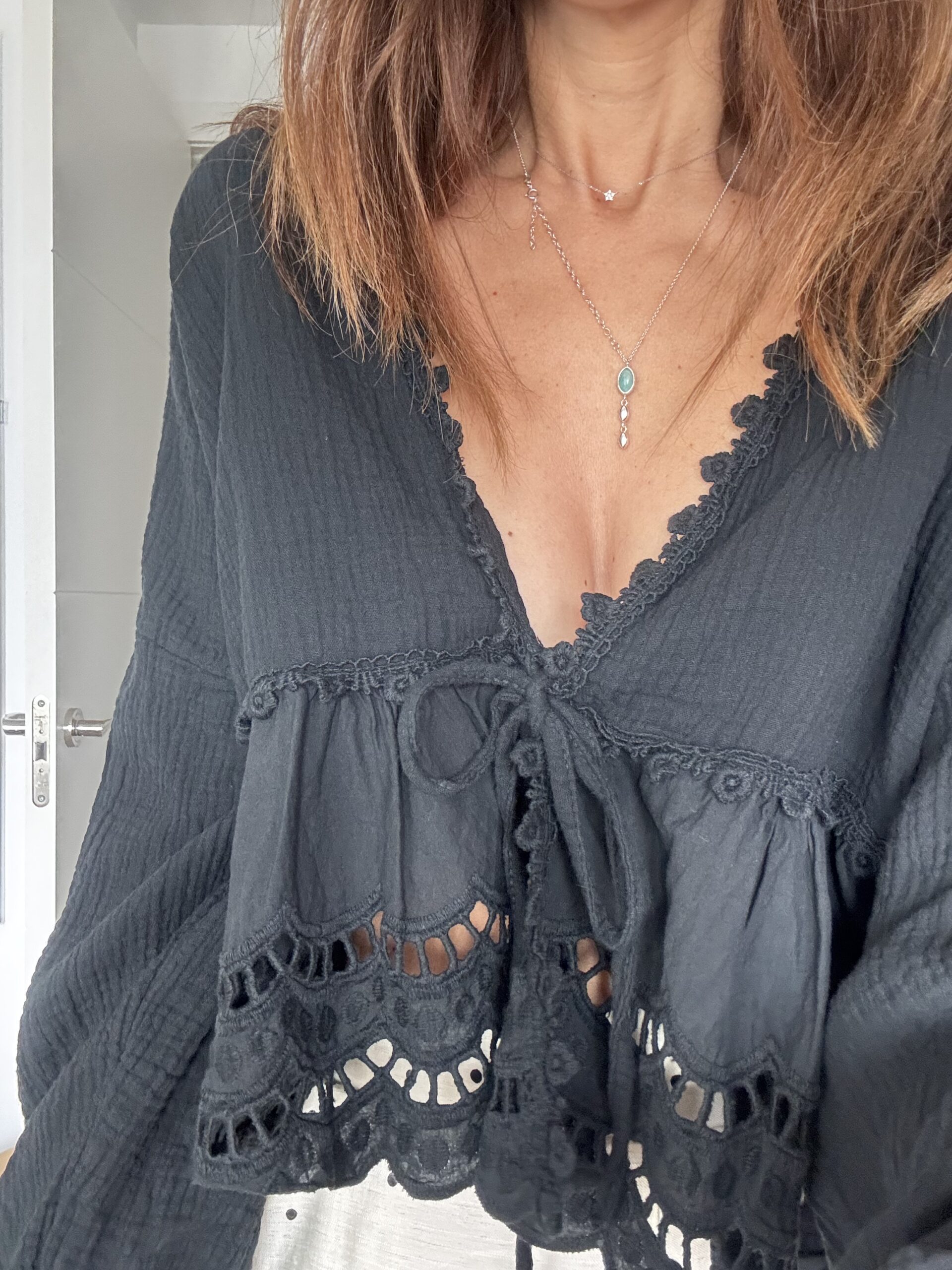 Blusa Boho Negra – 100% Algodón de Muselina con Encaje – Talla Única