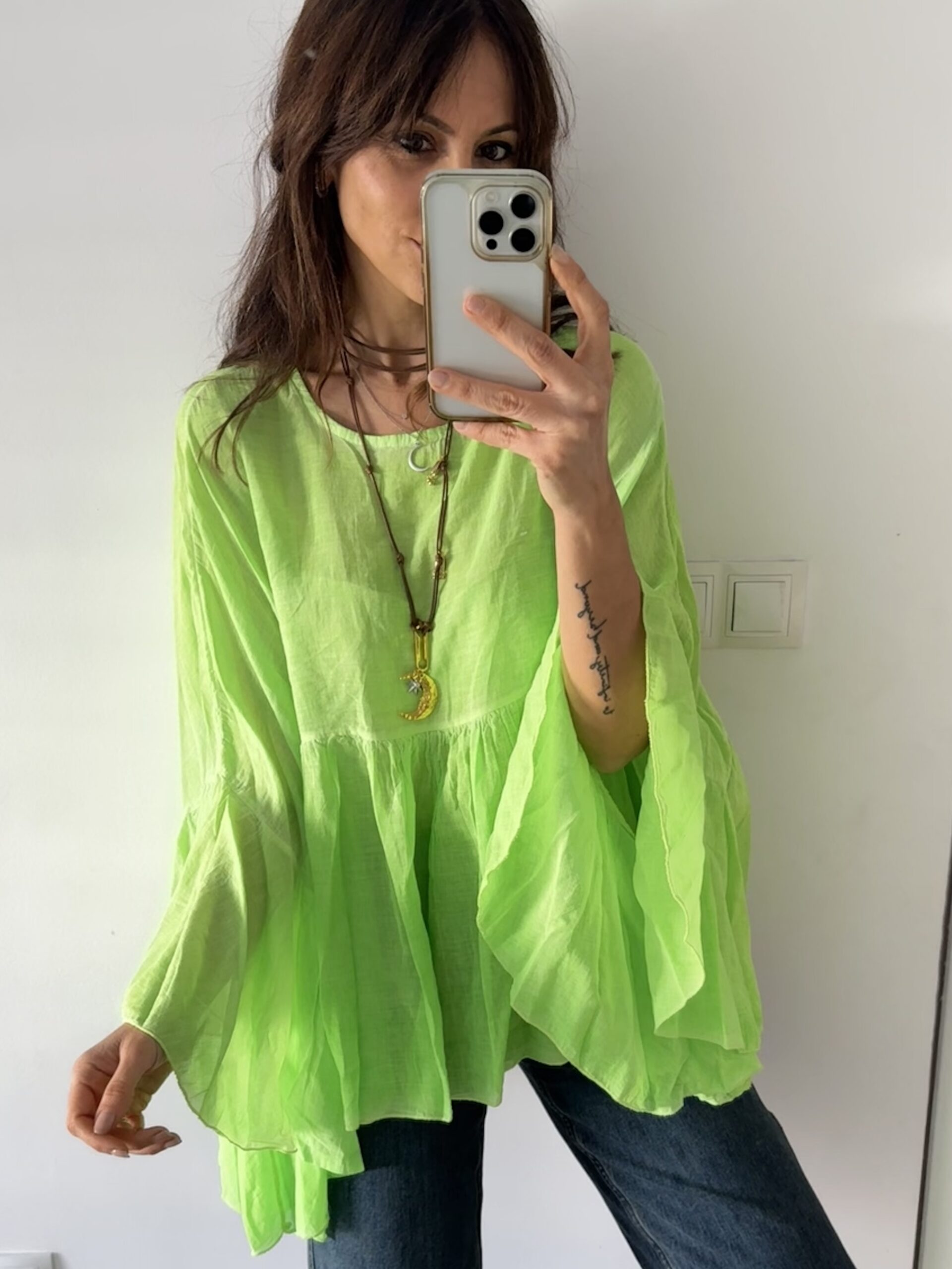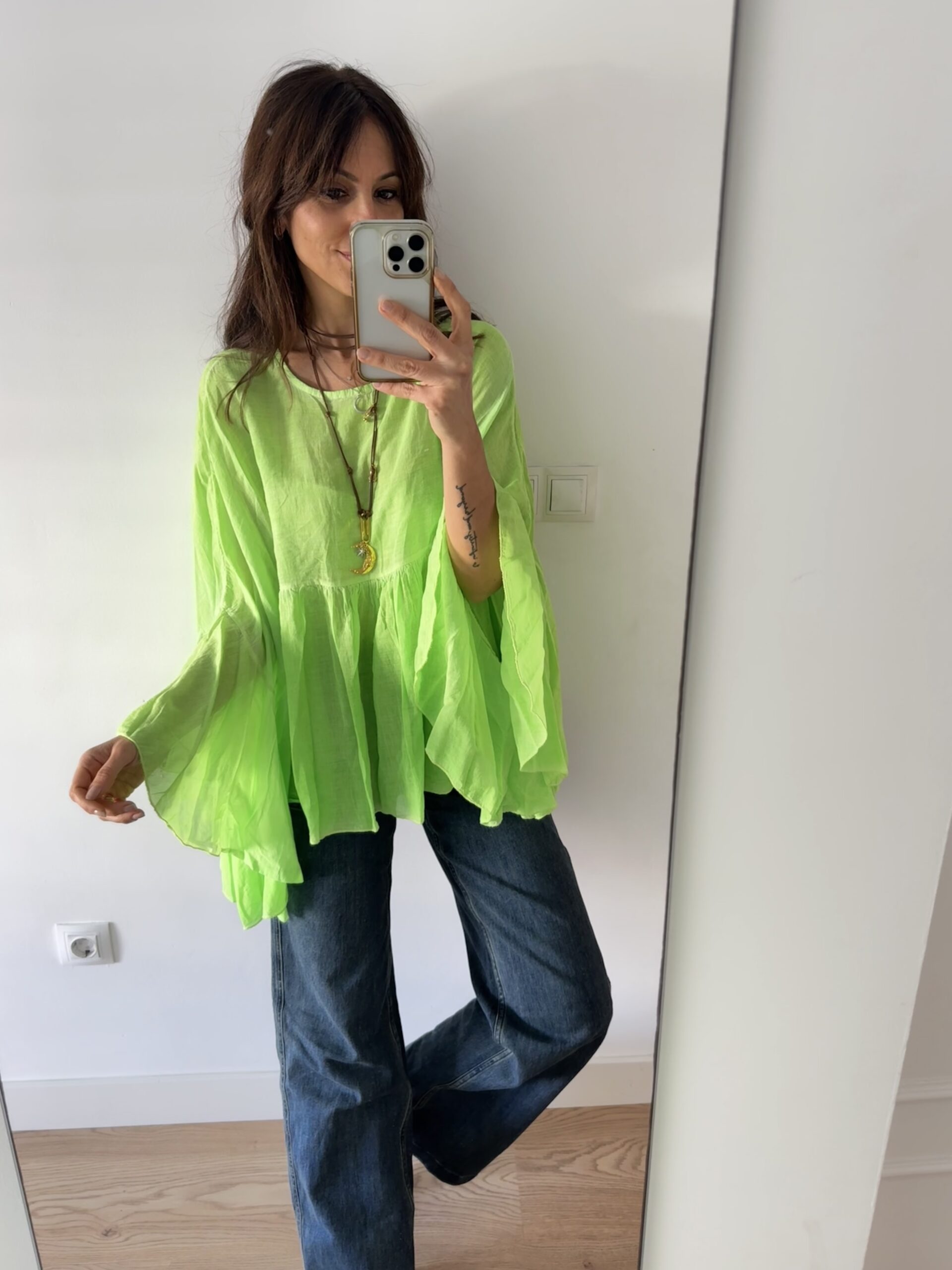 Si te gustan las prendas que no pasan desapercibidas, esta blusa oversize de algodón italiano en tono neón está hecha para ti. Vibrante, luminosa y con una silueta relajada que aporta movimiento y estilo sin renunciar a la comodidad.