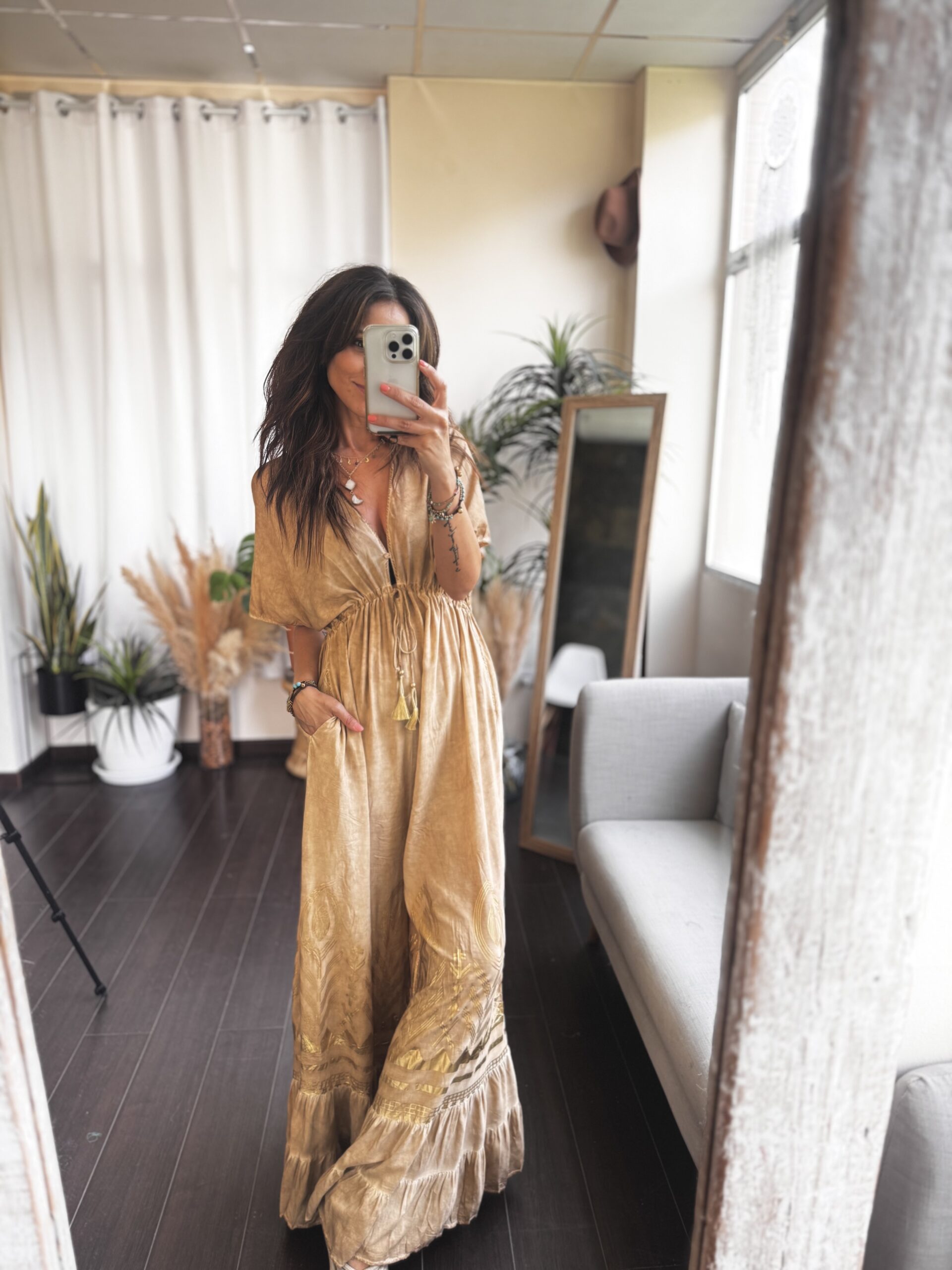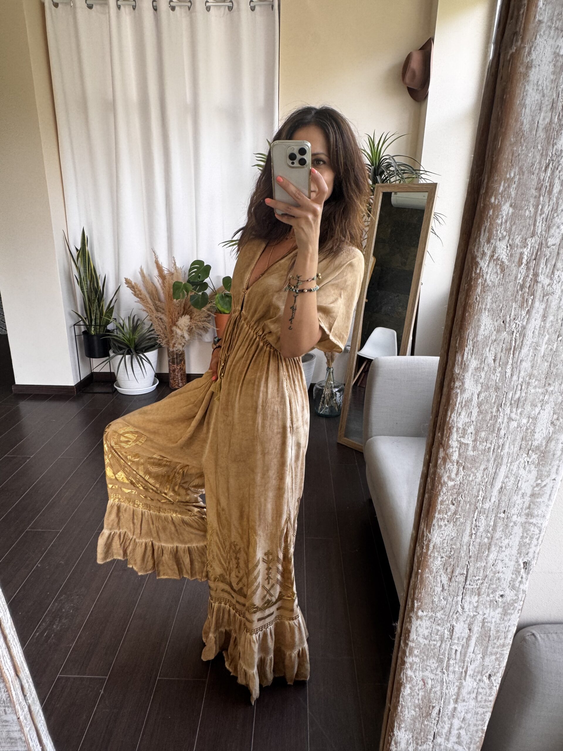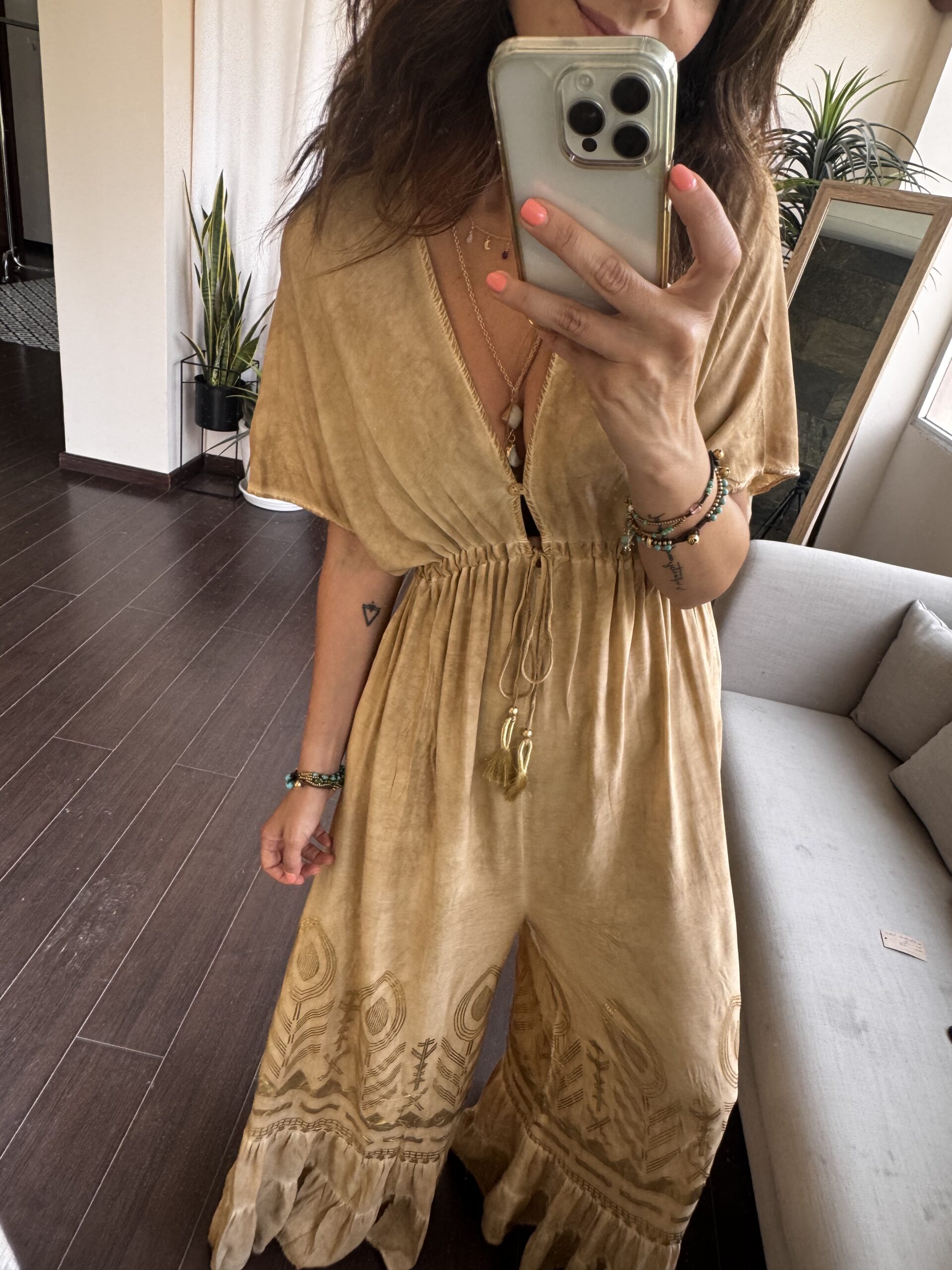 Su estampado en tonos tierra con detalles en dorado le da un aire sofisticado y veraniego al mismo tiempo. Un mono boho para brillar bajo el sol, sentirte cómoda y con rollazo sin renunciar al estilo.