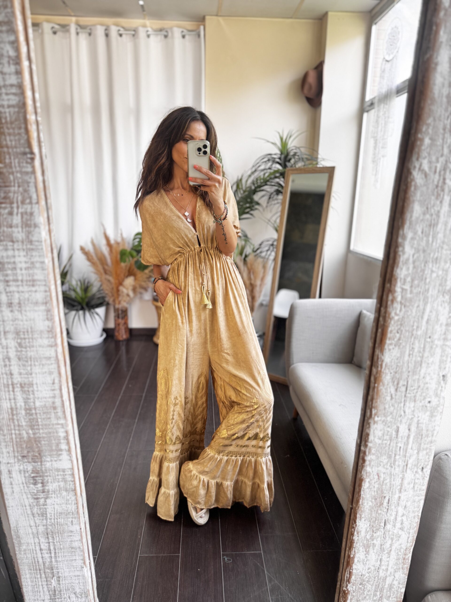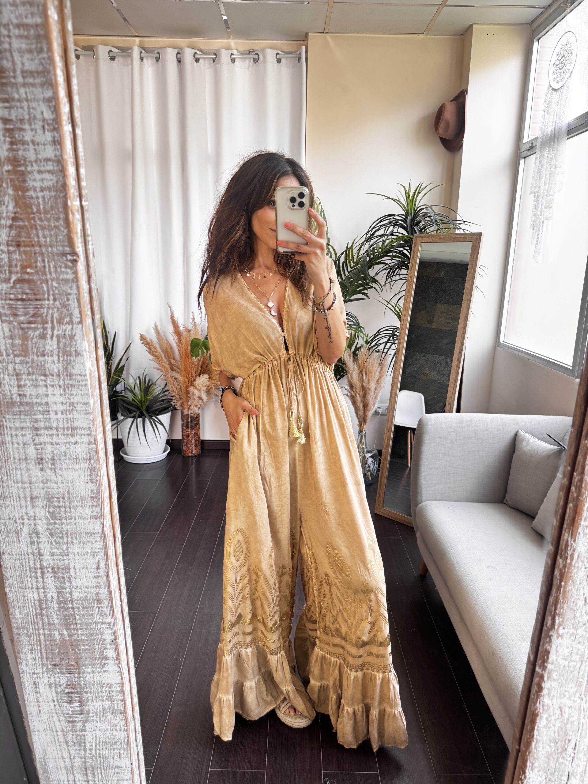 El Mono Evasé Tierra Oro es puro flow. Un diseño amplio, con escote en pico, mangas murciélago y pierna ancha con acabado en volante que le da ese movimiento que tanto nos gusta. Su tejido es ligero, fresco y con una caída espectacular que sienta de maravilla sin marcar.