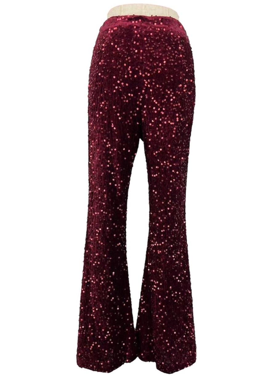 Confeccionado en un tejido recubierto de lentejuelas rojas, este pantalón ofrece un brillo vibrante sin renunciar a la comodidad. Su corte acampanado inspira una silueta fluida y favorecedora que alarga las piernas, mientras que la cintura alta aporta soporte y definición.