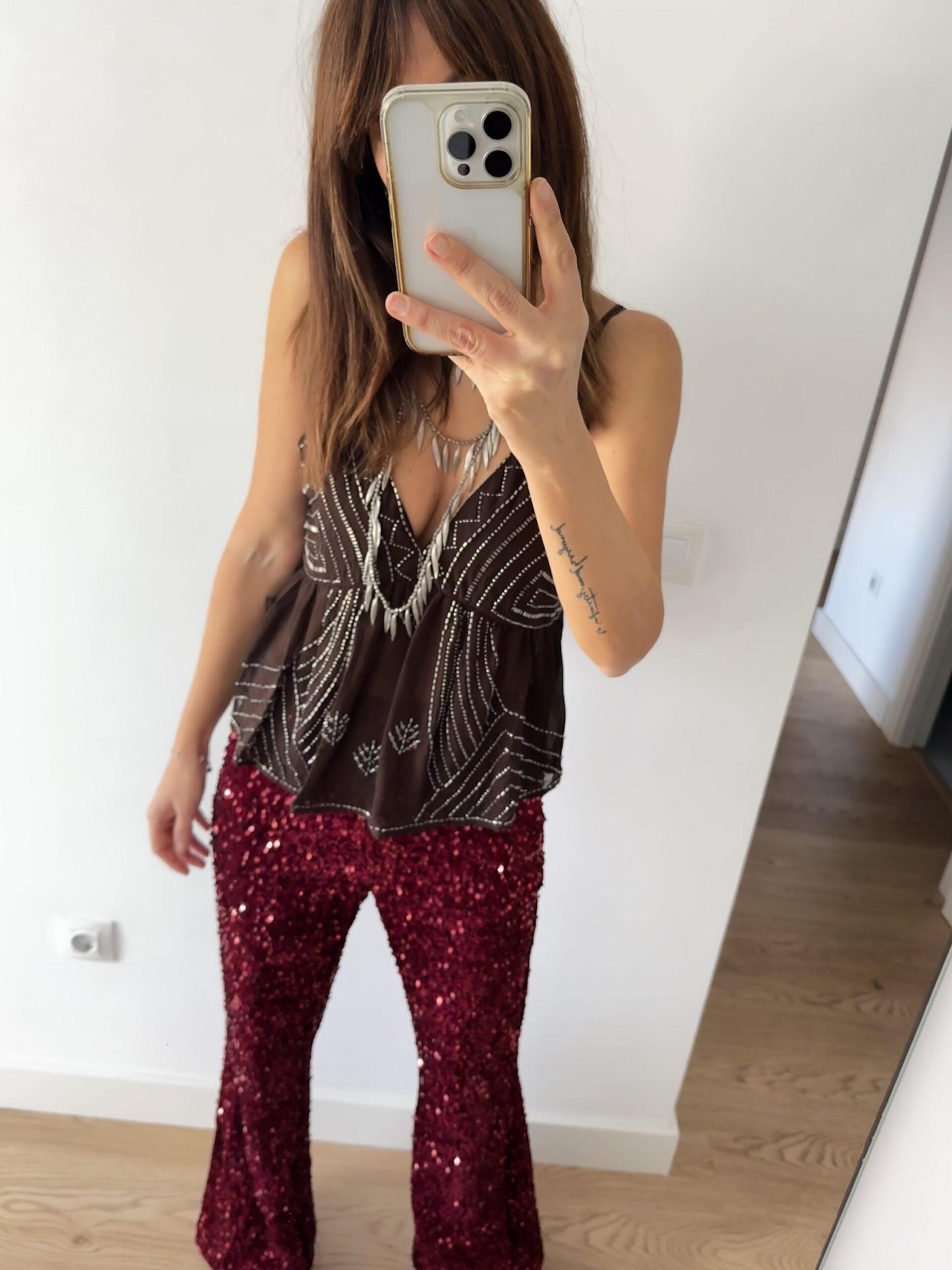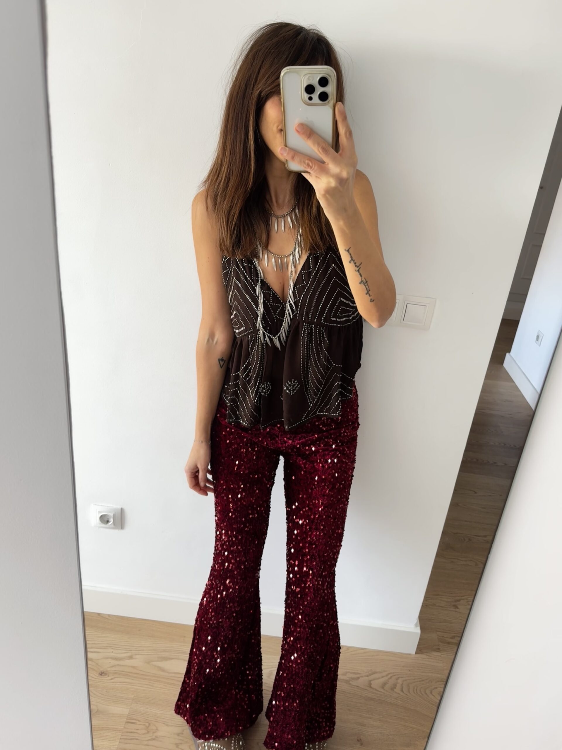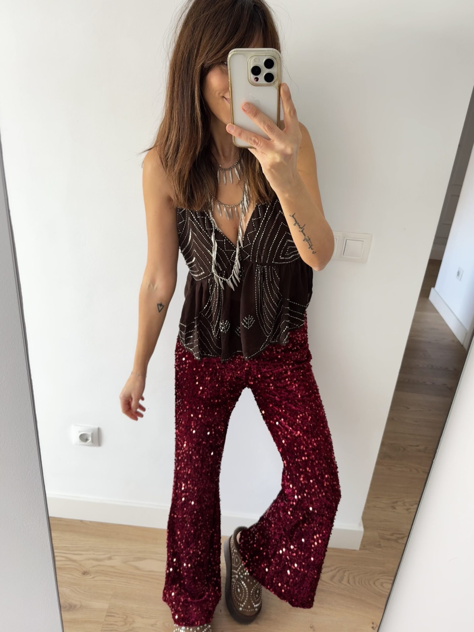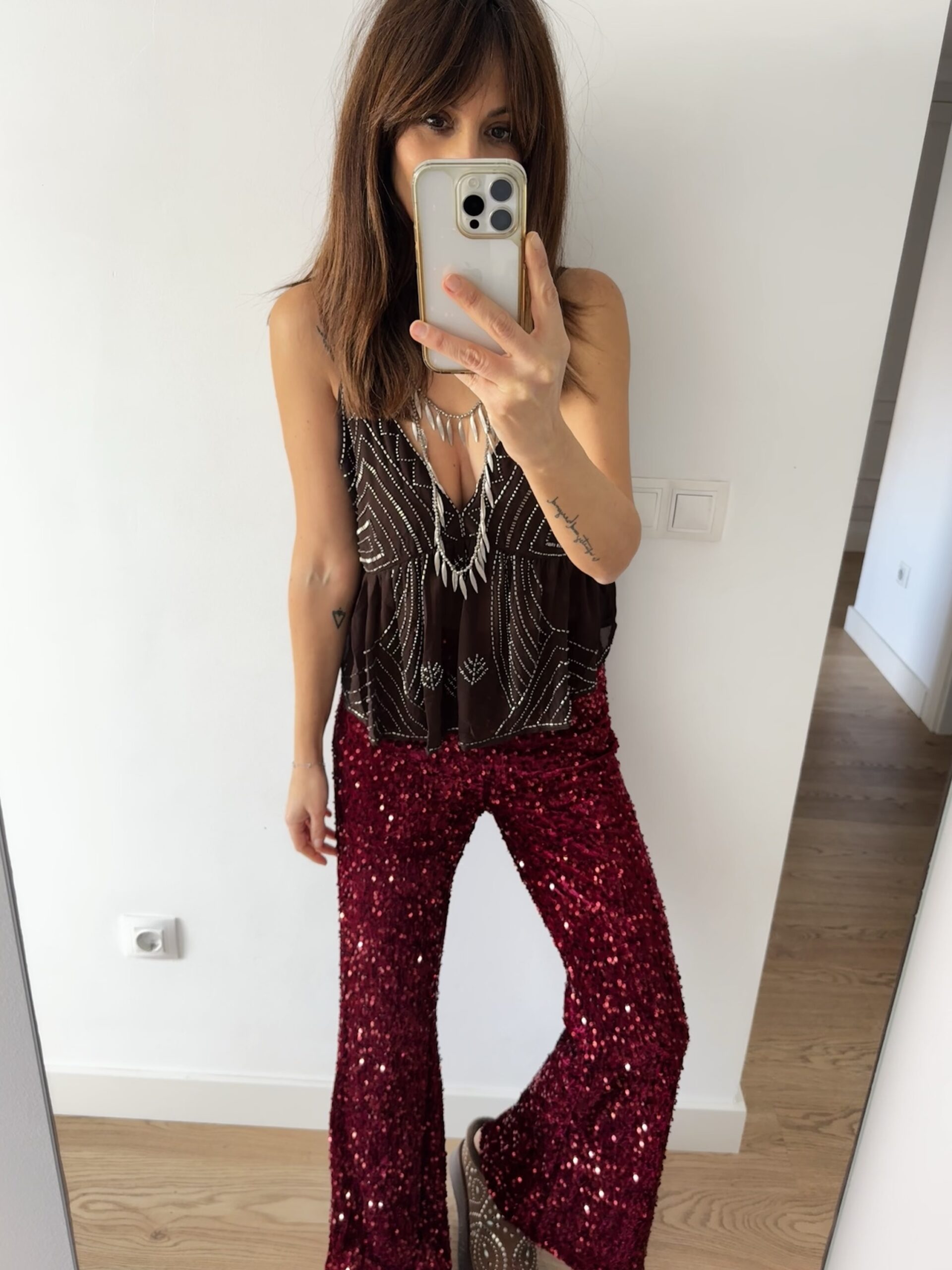 Este pantalón acampanado con lentejuelas rojas es una pieza deslumbrante que aporta un punto de glam y sofisticación a cualquier look. Perfecto para ocasiones especiales, eventos o noches en las que quieres brillar con un estilo atrevido y elegante.