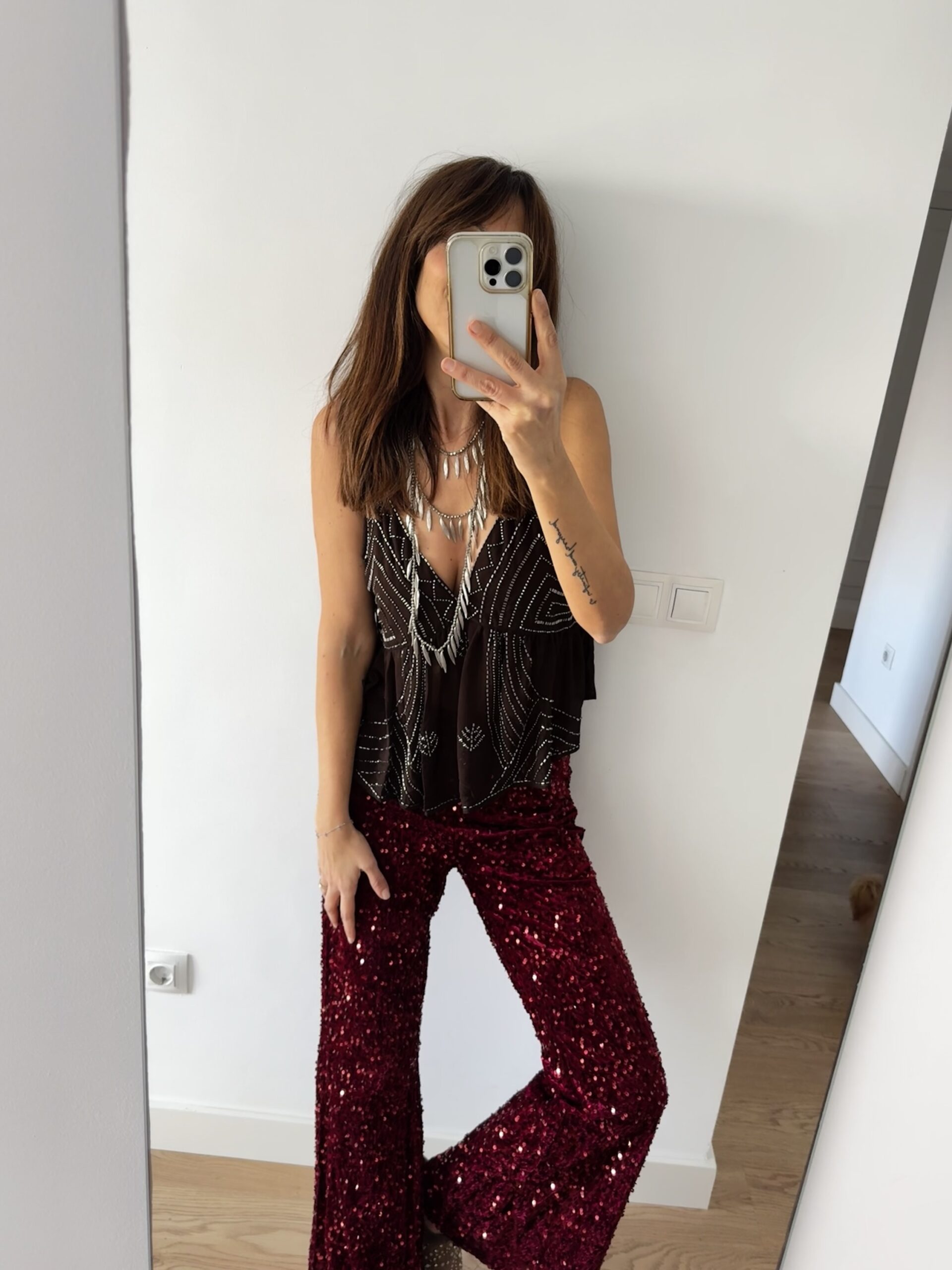 - Con un top negro liso o un body neutro para equilibrar el brillo intenso.