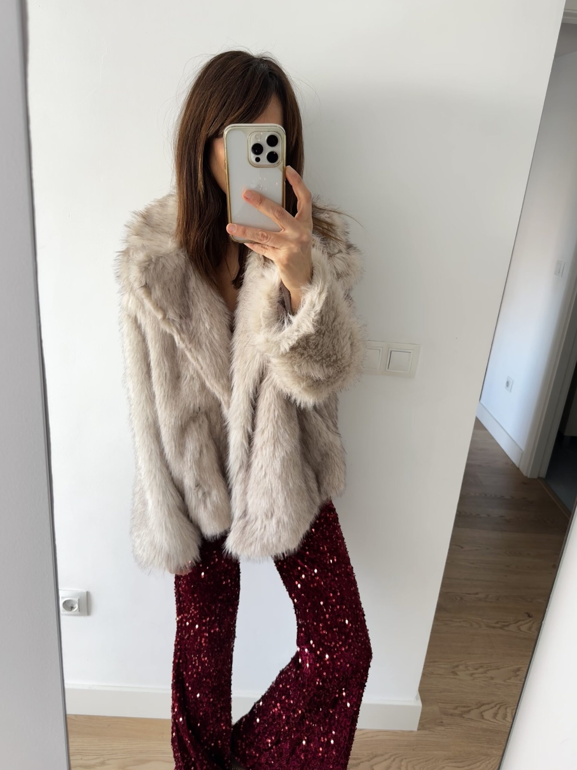 - Con una chaqueta o abrigo peluche: el contraste entre la textura suave del peluche y las lentejuelas rojas crea un look impactante y muy estiloso.