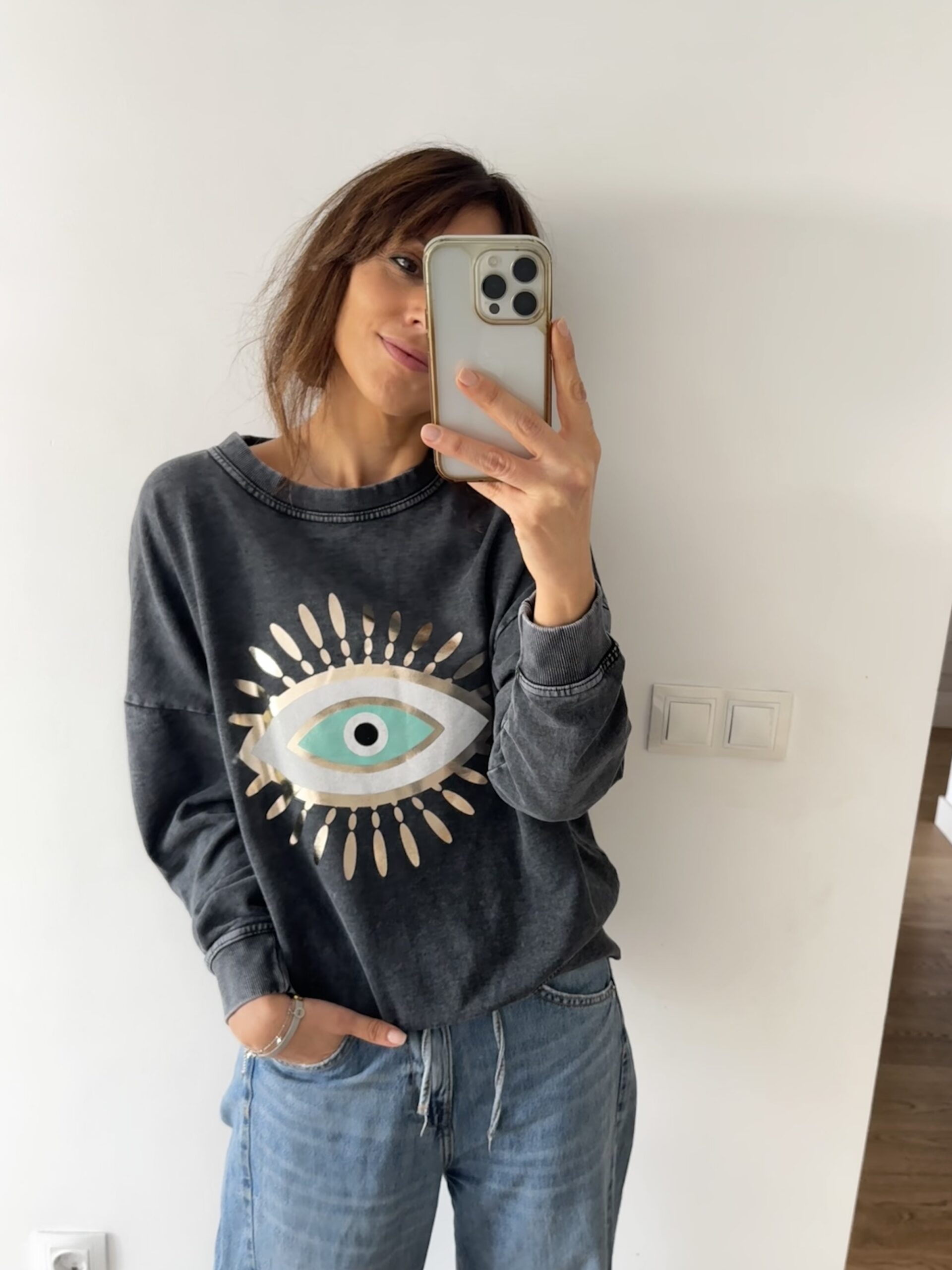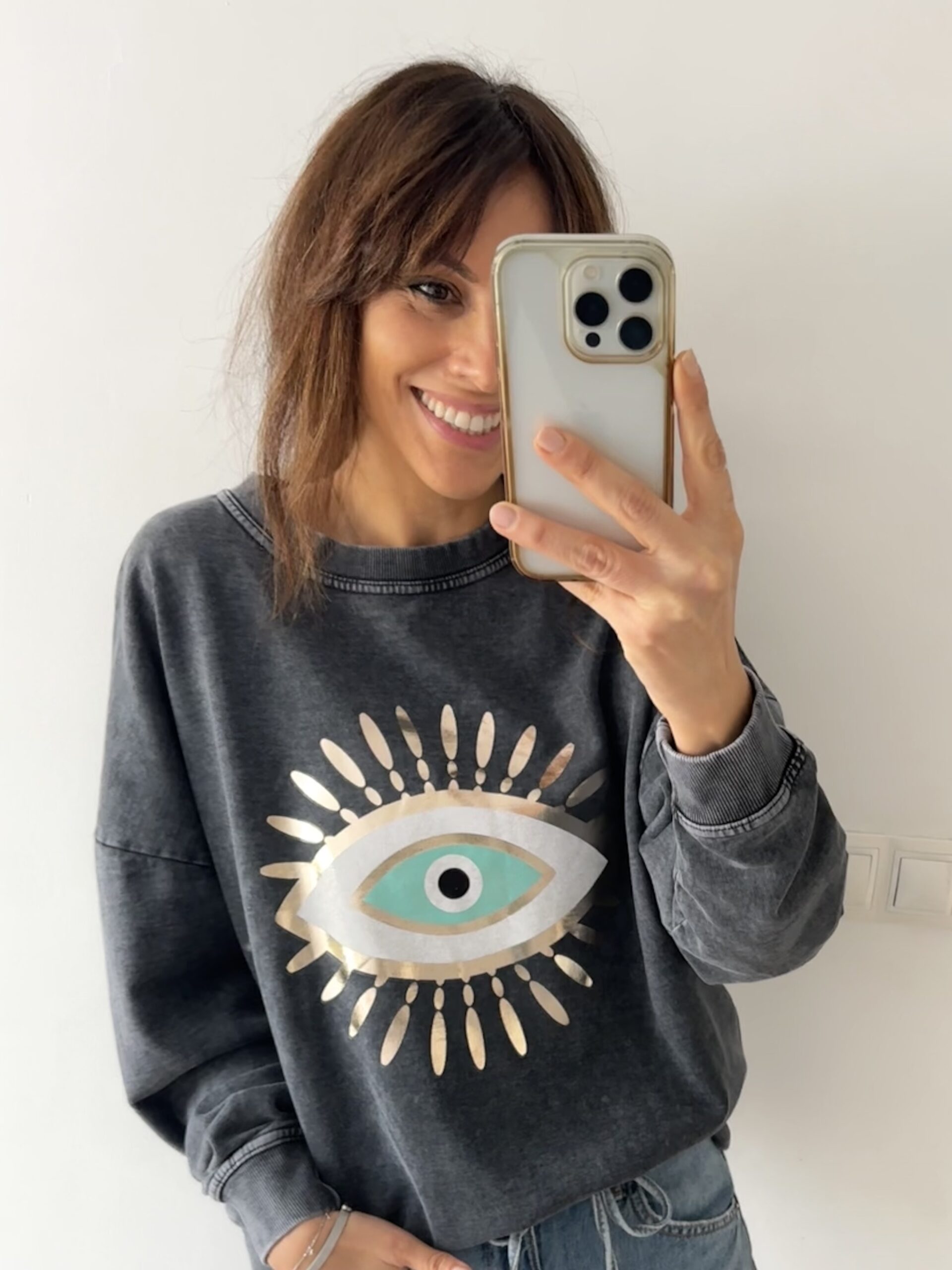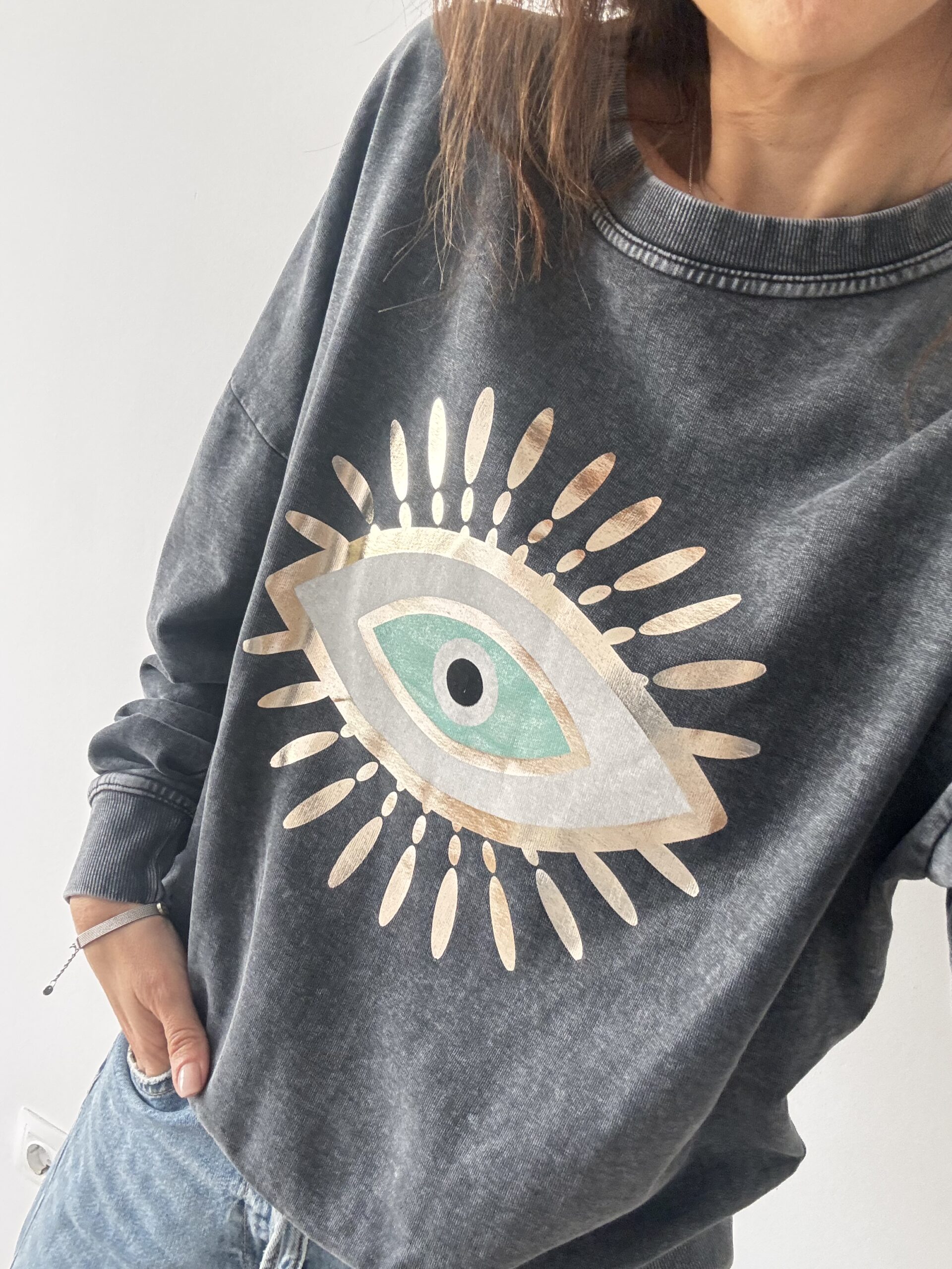 Sudadera gris lavado con ojo turco: calidez, estilo y energía especial