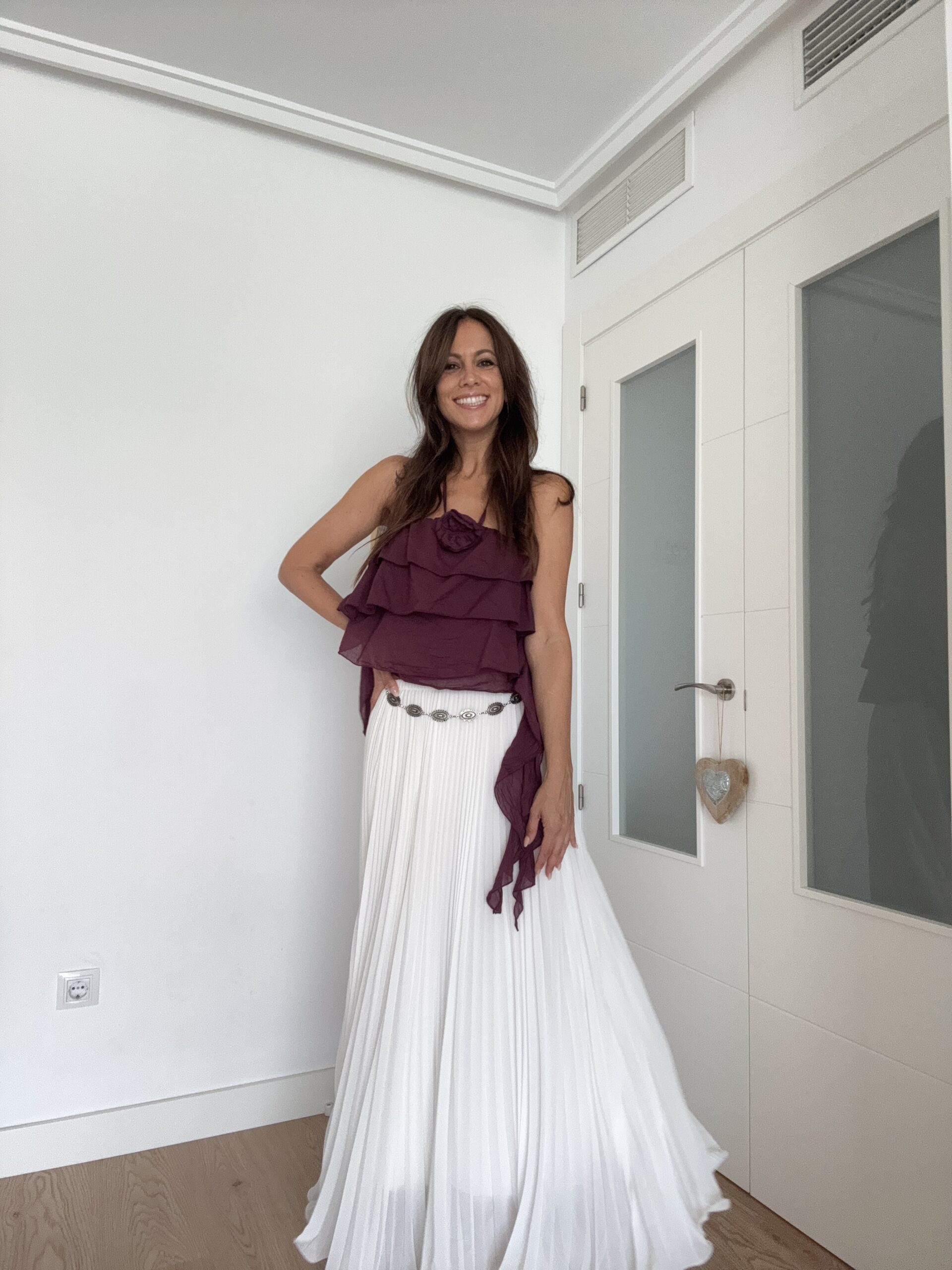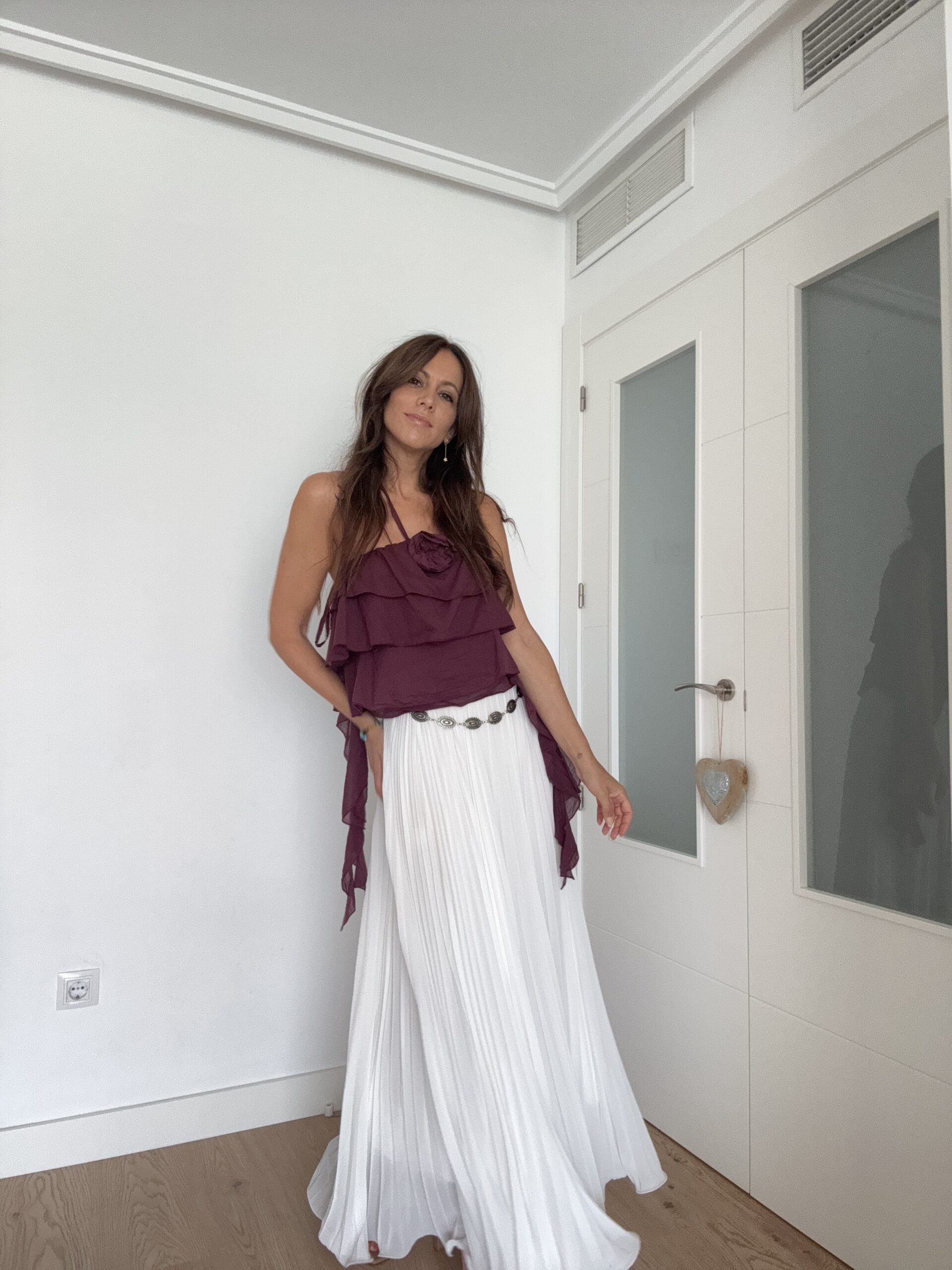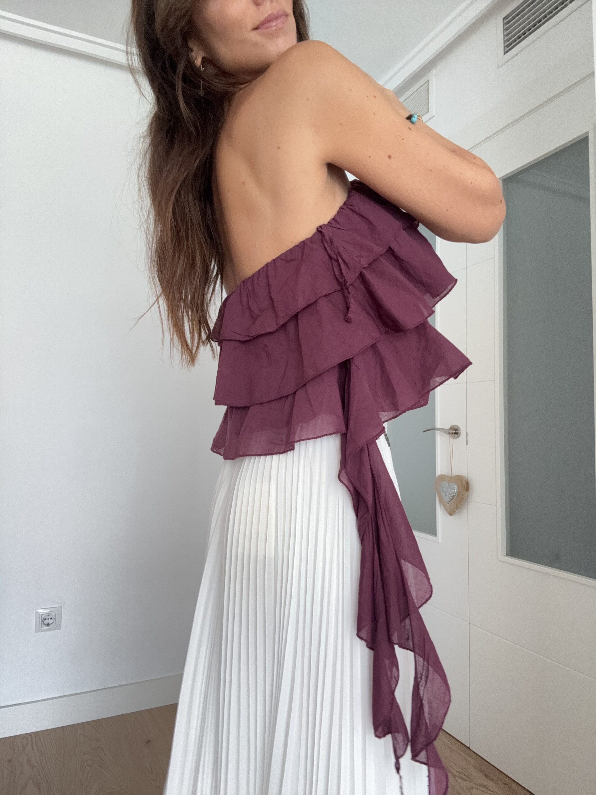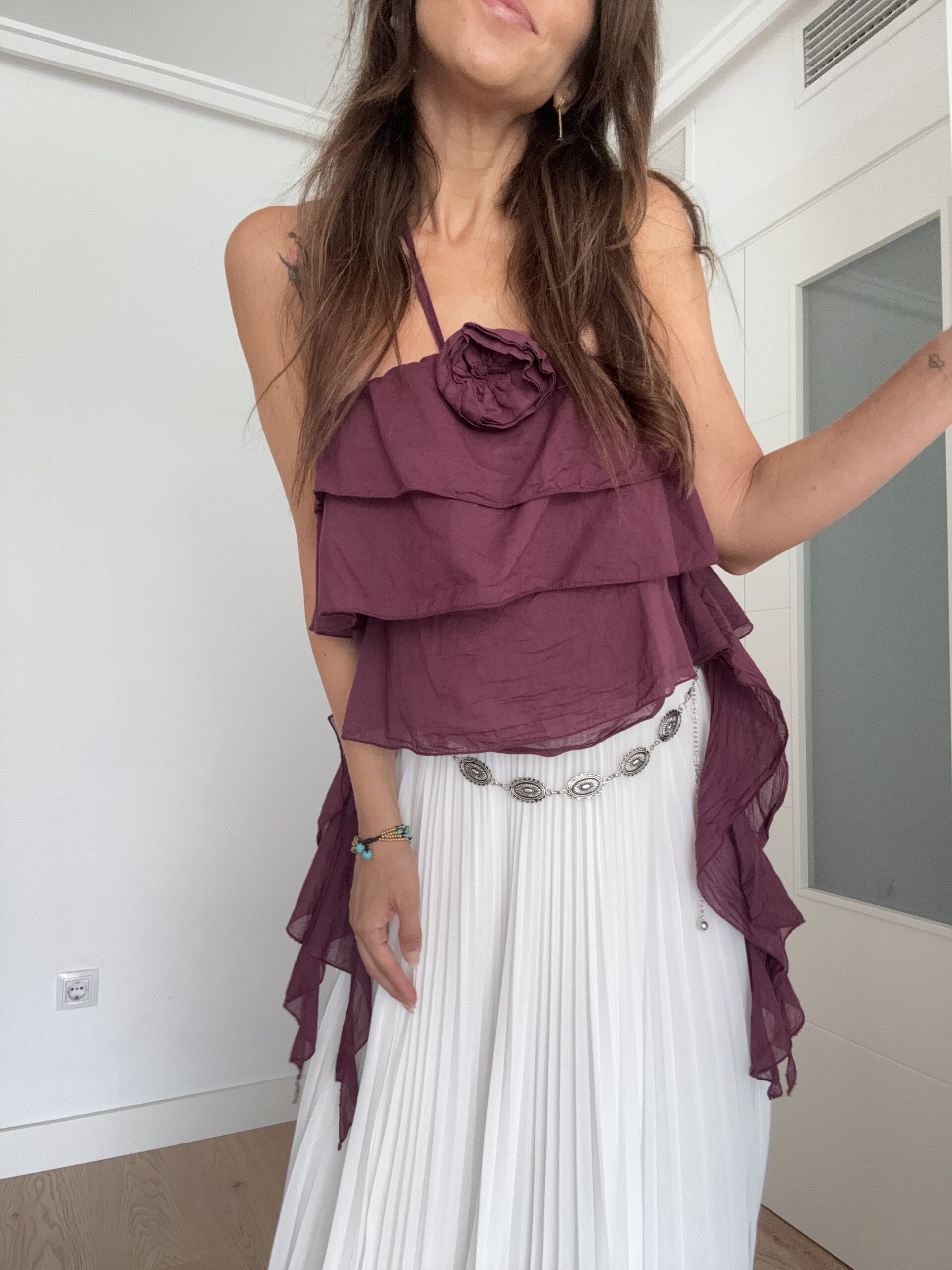 Este top con volantes tiene ese punto bohemio que tanto nos gusta: los volantes crean movimiento y feminidad, mientras que el detalle floral aporta un toque único sin recargar. El color ciruela es perfecto para combinar con neutros (blanco, beige, negro) y con estampados veraniegos. Además, la opción de llevar los tirantes al cuello o ocultarlos te permite transformar el top según la ocasión —desde un plan de día informal hasta una cena en terraza.