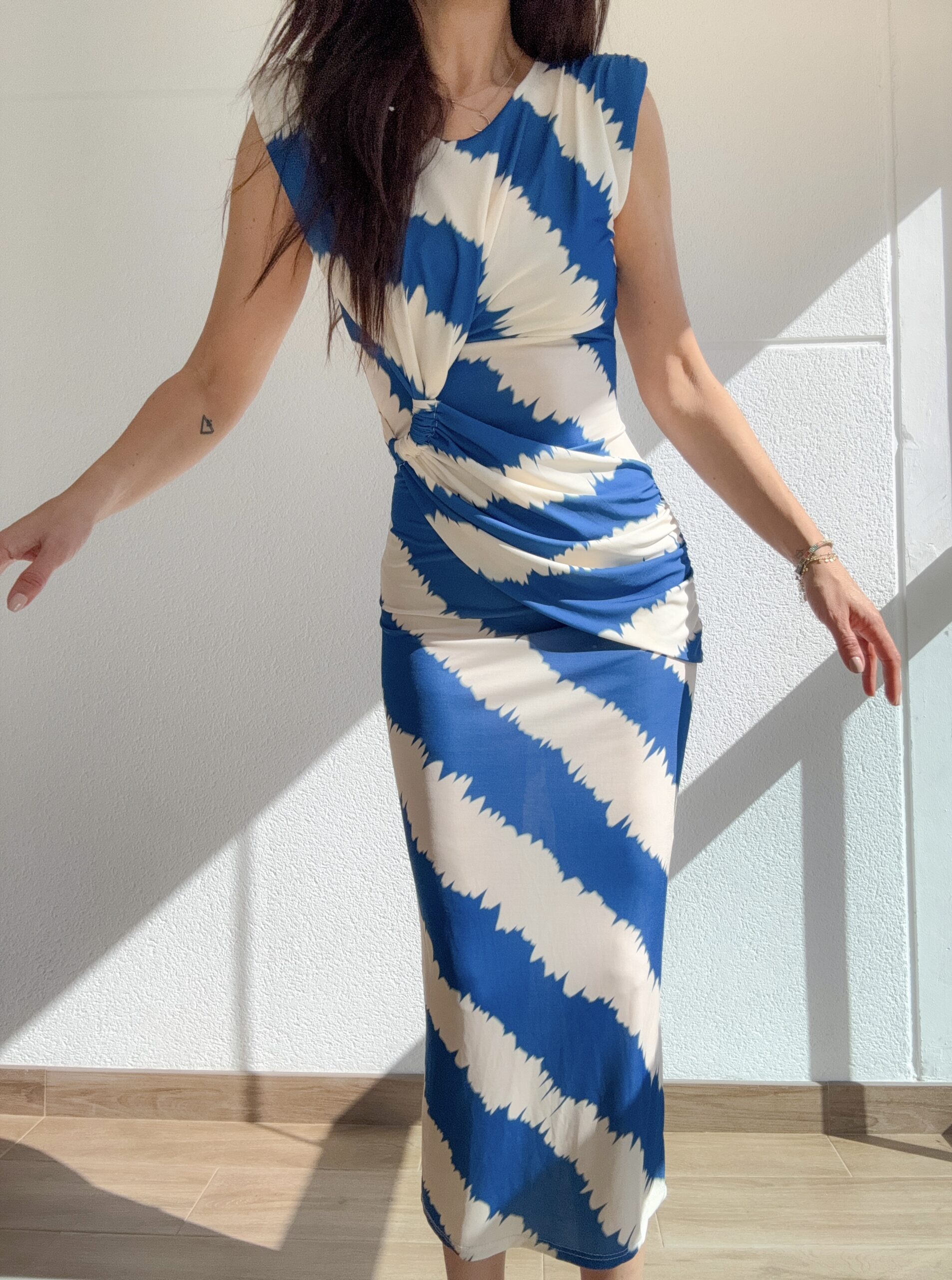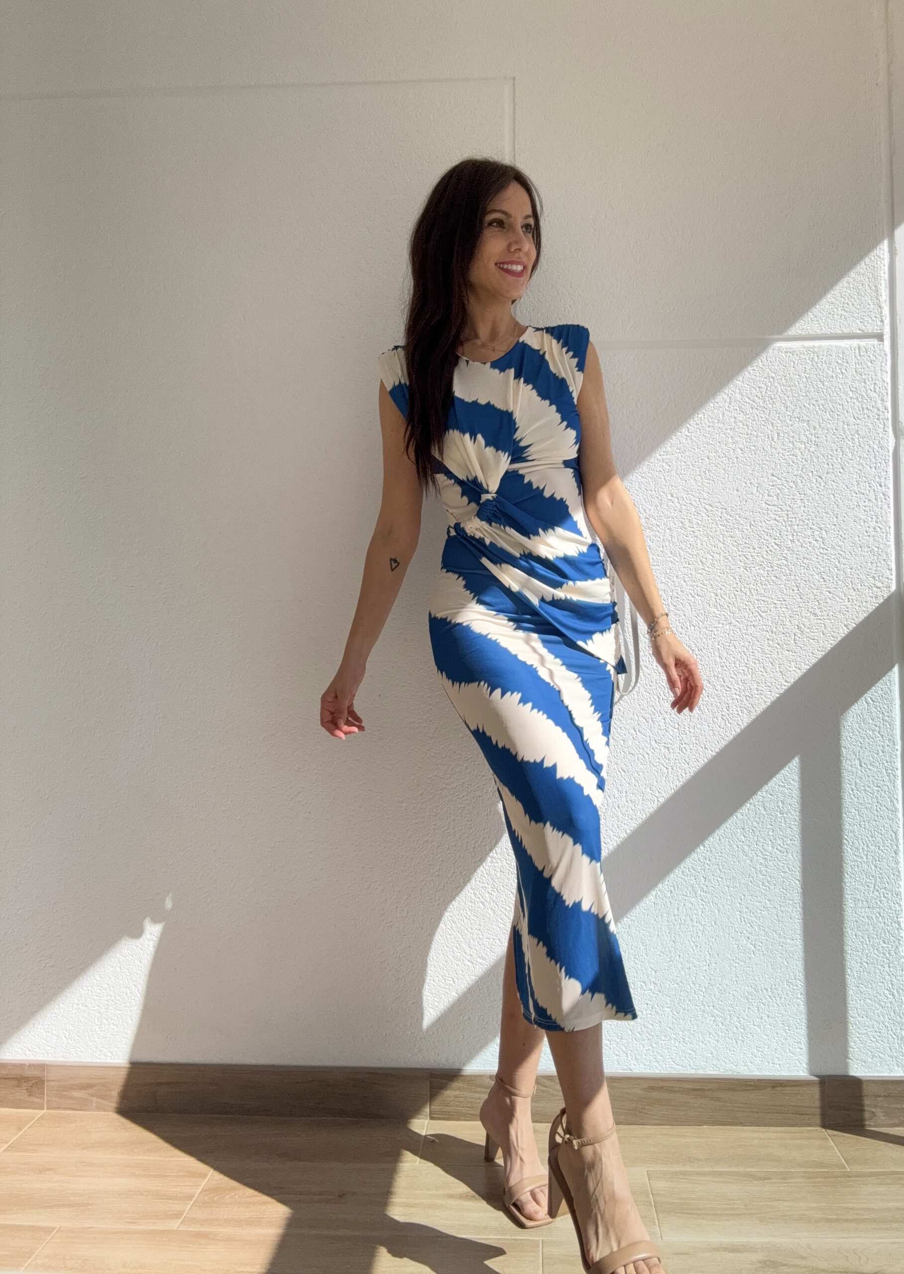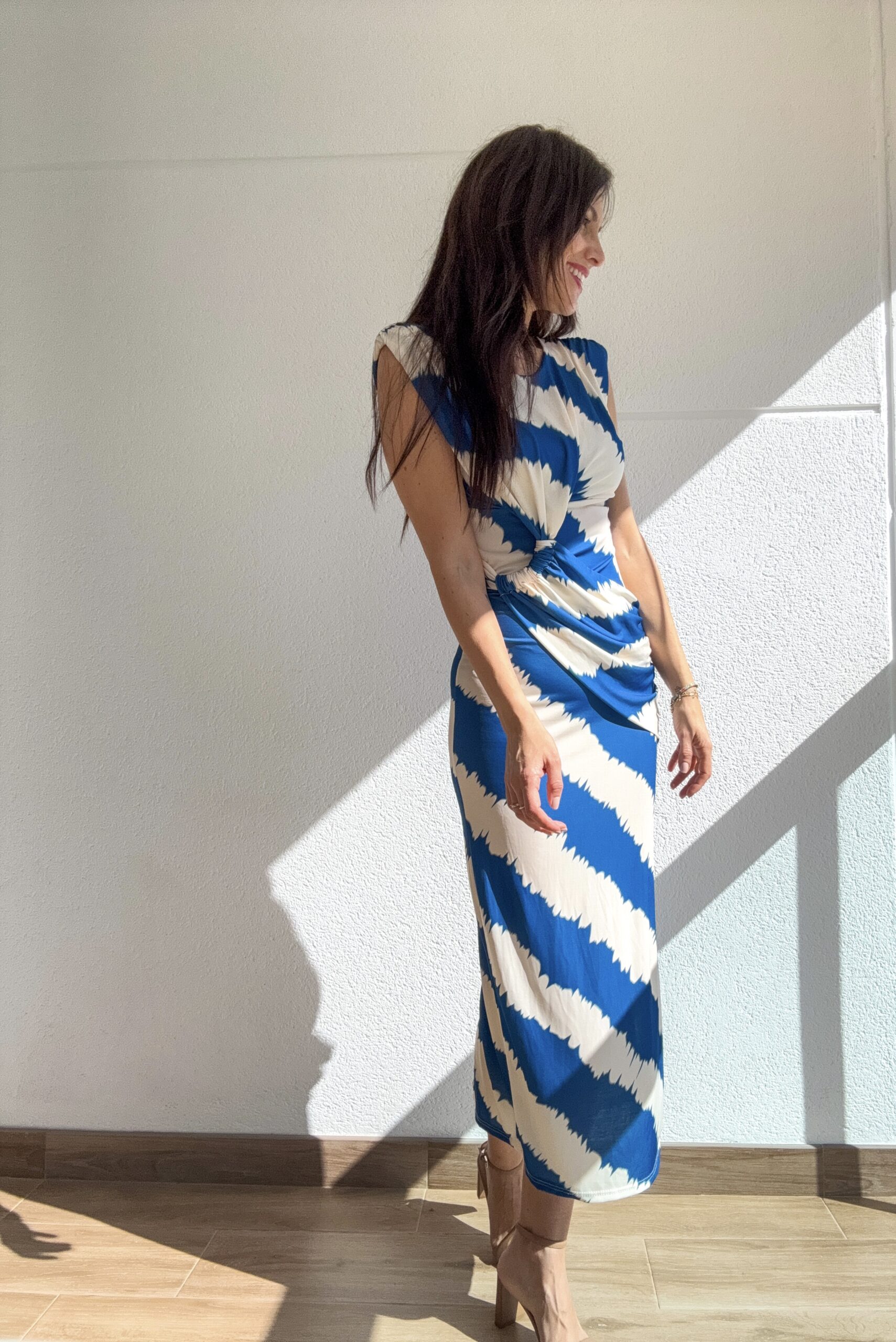 Este vestido ha sido diseñado pensando en la elegancia sin esfuerzo. Su corte entallado resalta la figura, mientras que el drapeado en la cintura aporta un efecto visual que estiliza y disimula, creando una silueta armónica y equilibrada.