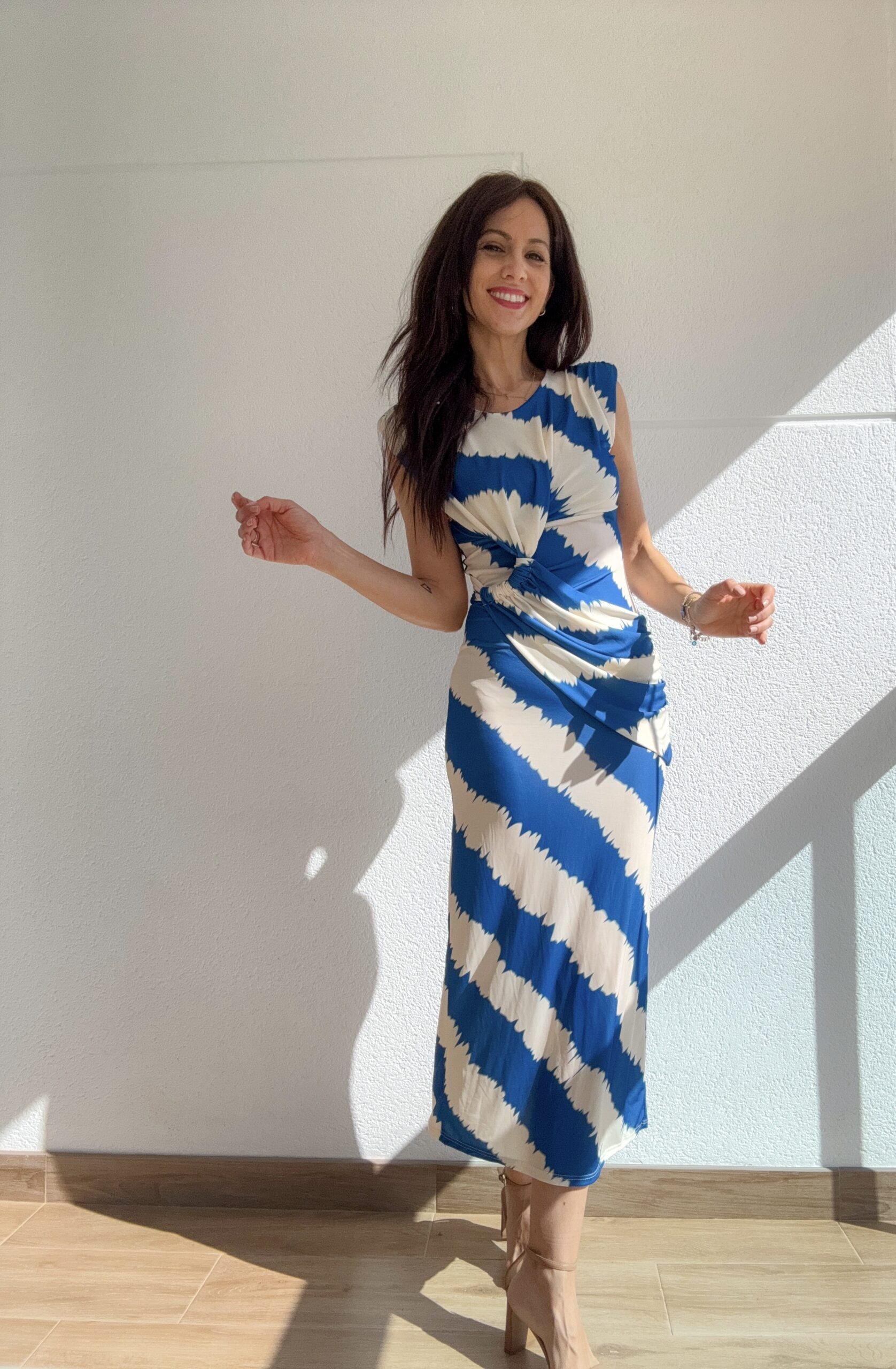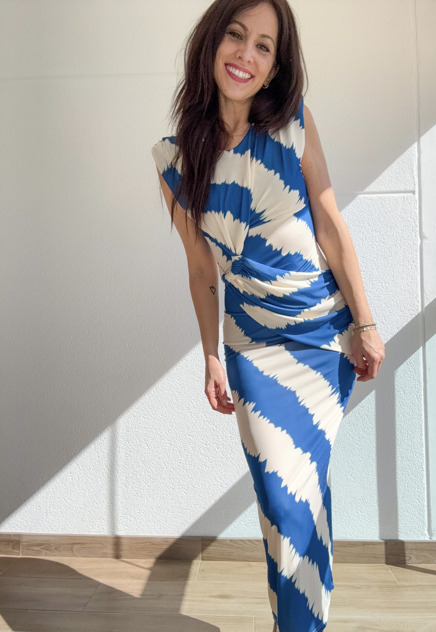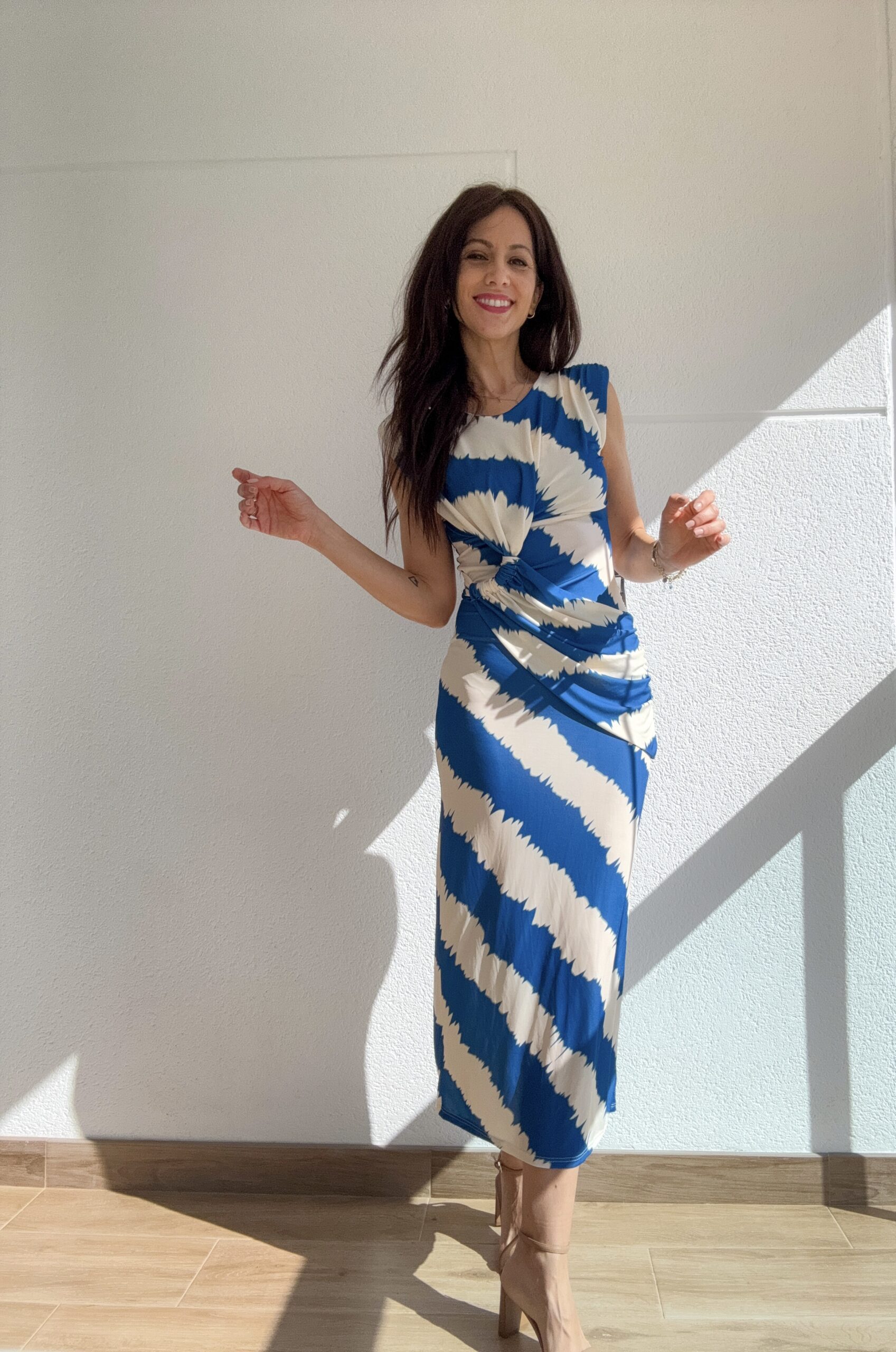 Este vestido ha sido diseñado pensando en la elegancia sin esfuerzo. Su corte entallado resalta la figura, mientras que el drapeado en la cintura aporta un efecto visual que estiliza y disimula, creando una silueta armónica y equilibrada.