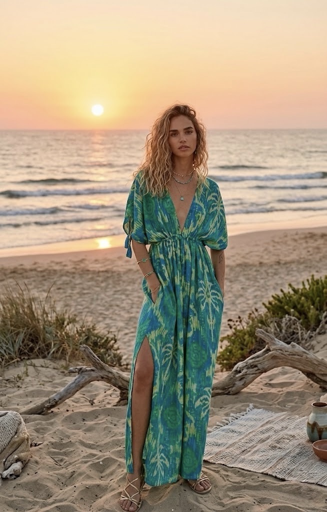 El Vestido Kimono Ibiza es la prenda perfecta para las mujeres que buscan un look relajado y lleno de estilo boho chic. Con su diseño fluido, estampado vibrante y corte favorecedor, este vestido es ideal para los días más cálidos, ofreciéndote tanto confort como un estilo único que te hará destacar en cualquier ocasión.