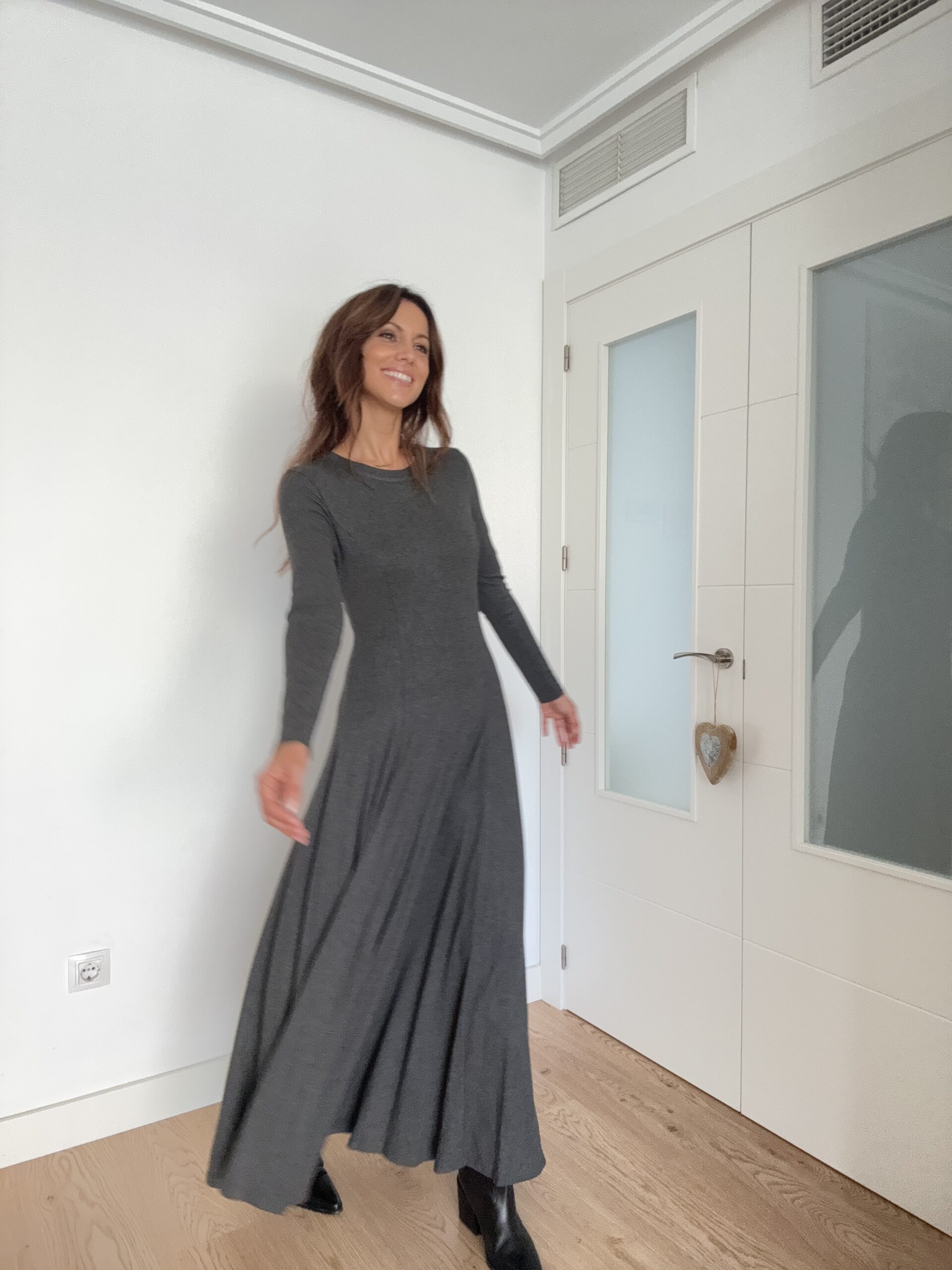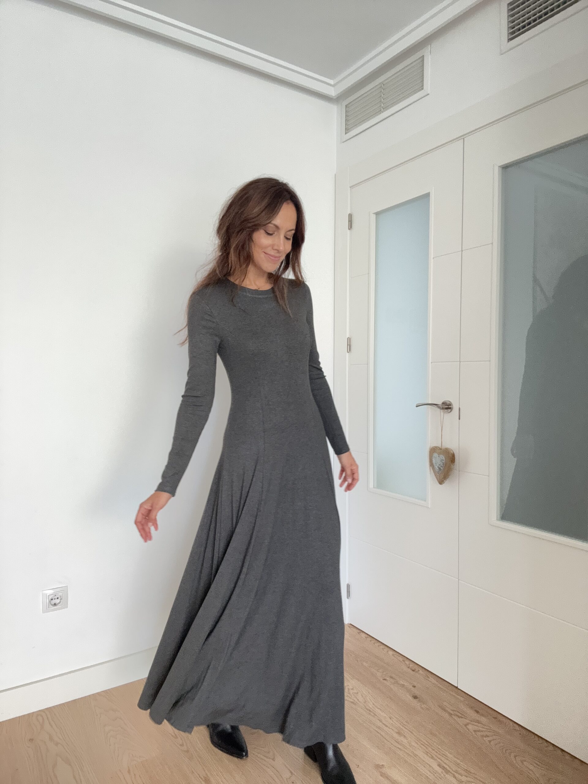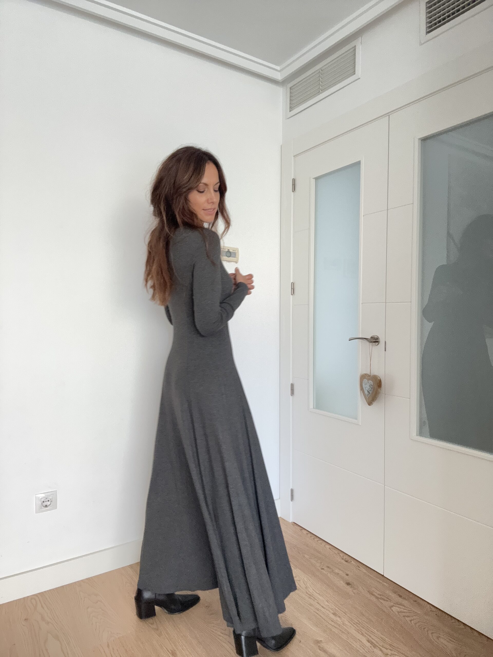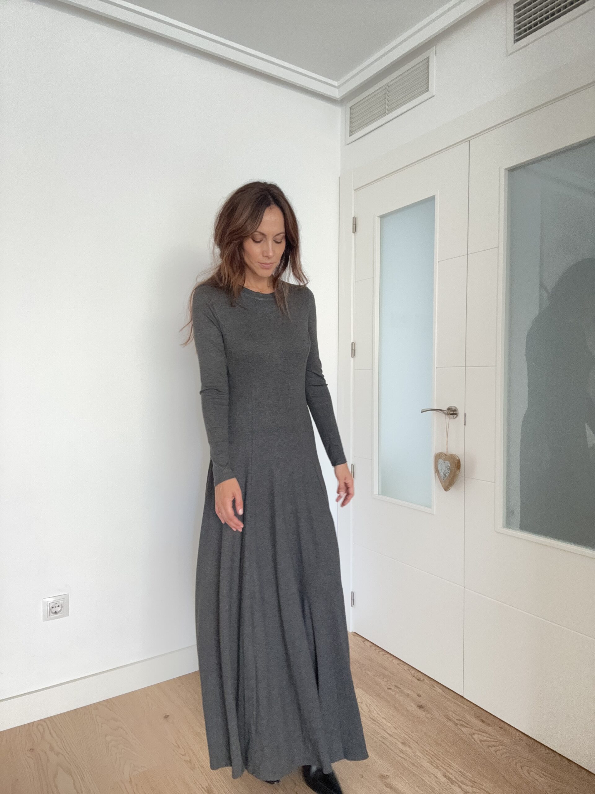 Este vestido largo en color gris con falda de corte A es una de esas prendas que se convierten en fondo de armario desde el primer momento. Su diseño elegante, cómodo y versátil lo hace perfecto para múltiples ocasiones, desde un look relajado de día hasta una opción más sofisticada para la noche.
