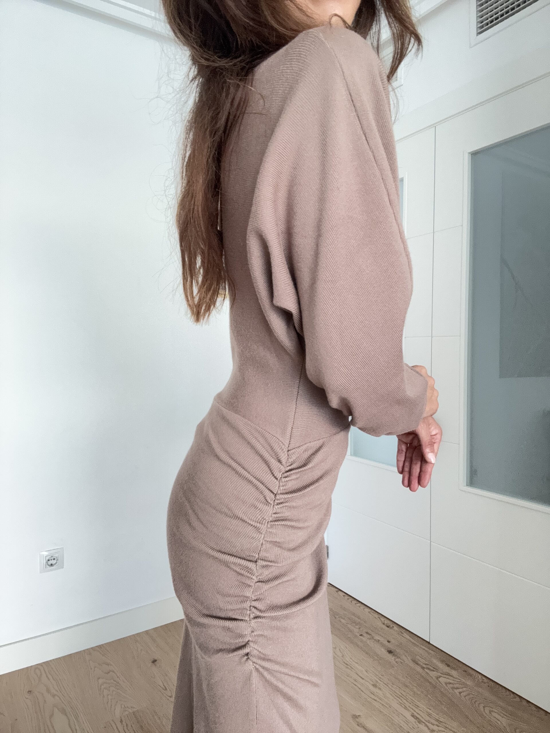 Las mangas largas tipo murciélago aportan movimiento y un aire desenfadado, mientras que el detalle de frunces laterales en la cadera con efecto drapeado realza la silueta de forma natural. Además, cuenta con una abertura lateral en la falda que suma un punto de sensualidad sin dejar de ser elegante. Todo ello con acabados cuidados en el dobladillo y los puños, que le dan un toque limpio y sofisticado.