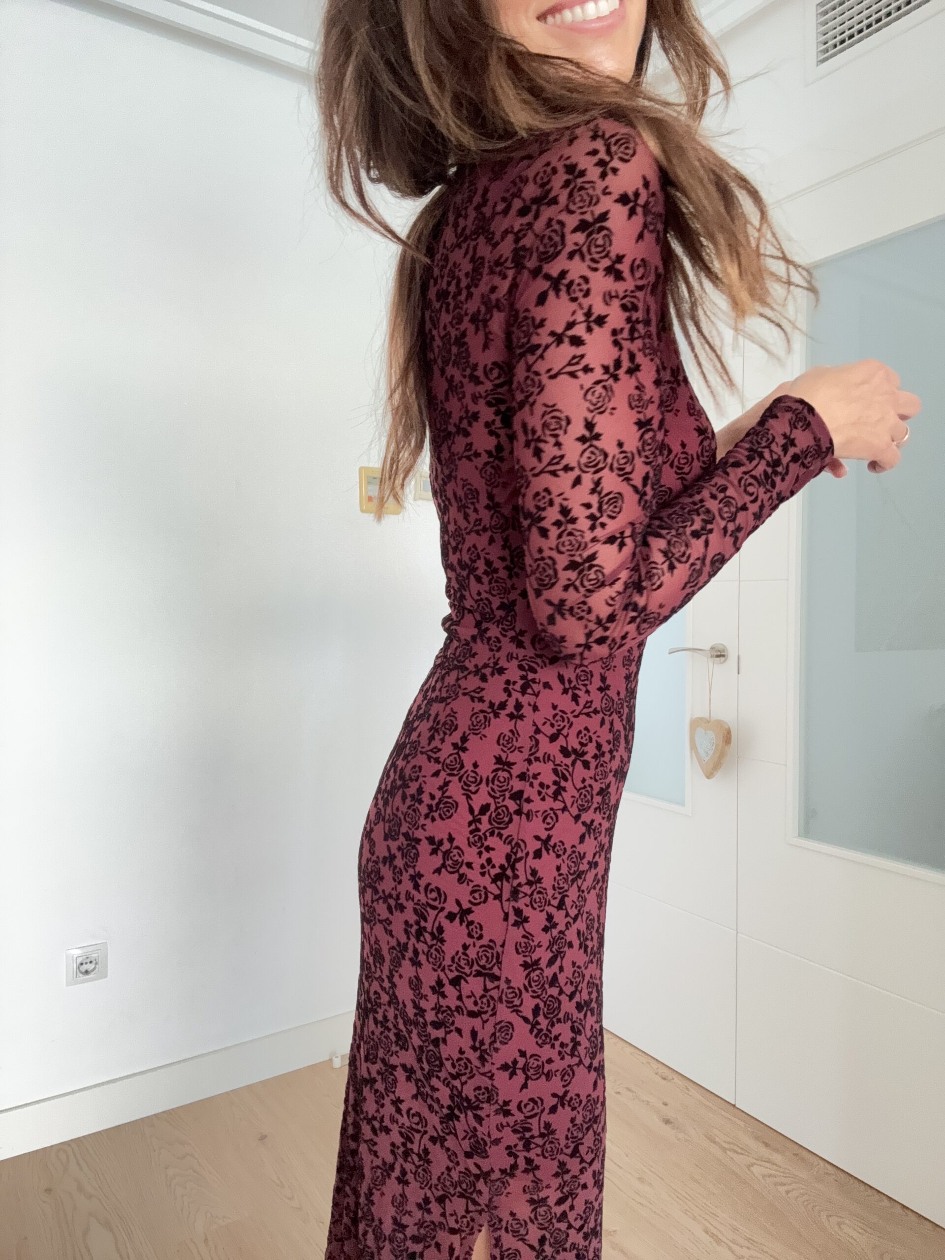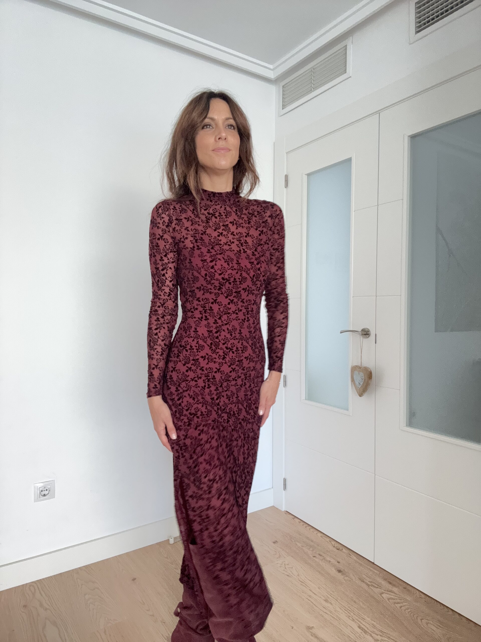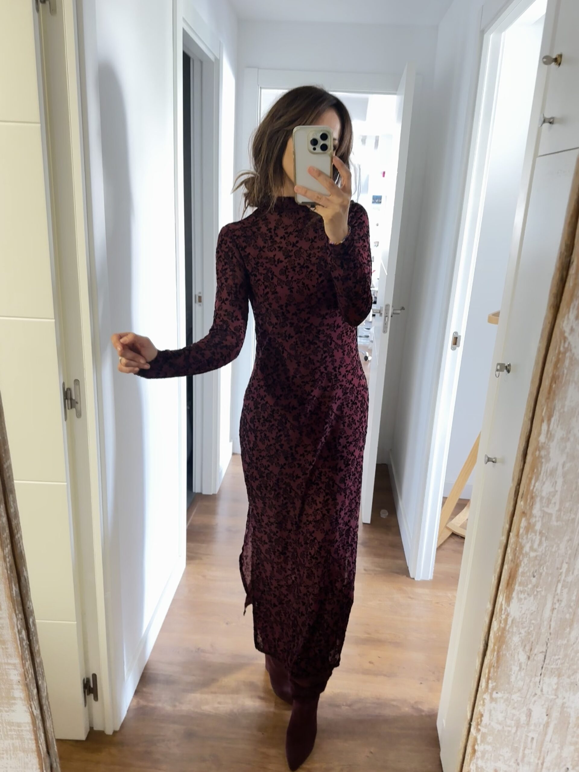 Un vestido que destaca por sus detalles aterciopelados y su tono burdeos profundo, pensado para mujeres que quieren sentirse especiales y estilizadas esta temporada.