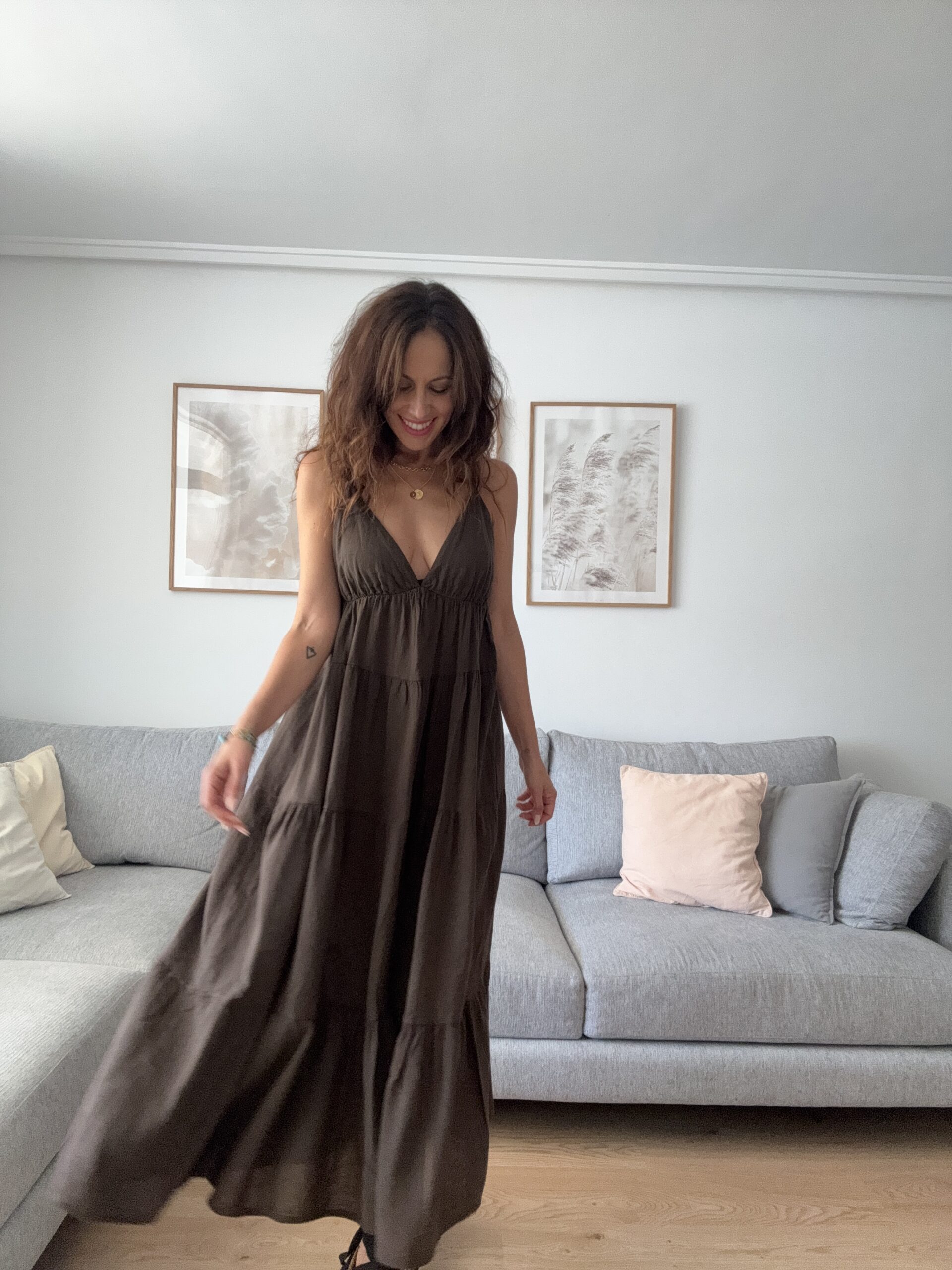 Está disponible en tallas S, M y L, para que puedas elegir la que mejor se adapte a ti. El tono marrón chocolate es cálido, favorece mucho con la piel bronceada y combina genial con accesorios en tonos tierra, dorados o naturales. Una de esas prendas que valen para todo: desde una comida informal hasta una tarde de paseo.